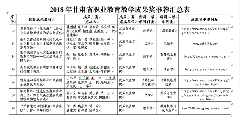 根據(jù)甘肅省人力資源和社會保障廳、甘肅省教育廳《關于開展2018年甘肅省職業(yè)教育教學成果獎評選表彰工作的通知》精神,經(jīng)個人申報,學院審核,決定擬推薦以下所提交紙質材料、電子材料、申報網(wǎng)站等符合申報要求的12項教學成果參評2018年甘肅省職業(yè)教育教學成果獎,現(xiàn)予以公示。