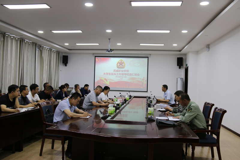 6月14日上午,由武威軍分區(qū)副司令員丁全綱帶隊(duì),市教育局督學(xué)張應(yīng)偉、涼州區(qū)人武部政委丁俊強(qiáng)、涼州區(qū)人武部副部長韓小偉、涼州區(qū)西關(guān)街武裝部部長趙光慶一行5人到我院督導(dǎo)檢查征兵工作,學(xué)院副院長田迎春、學(xué)工處處長王守云陪同檢查。各系黨總支書記、輔導(dǎo)員參加了匯報(bào)會,田迎春主持會議。