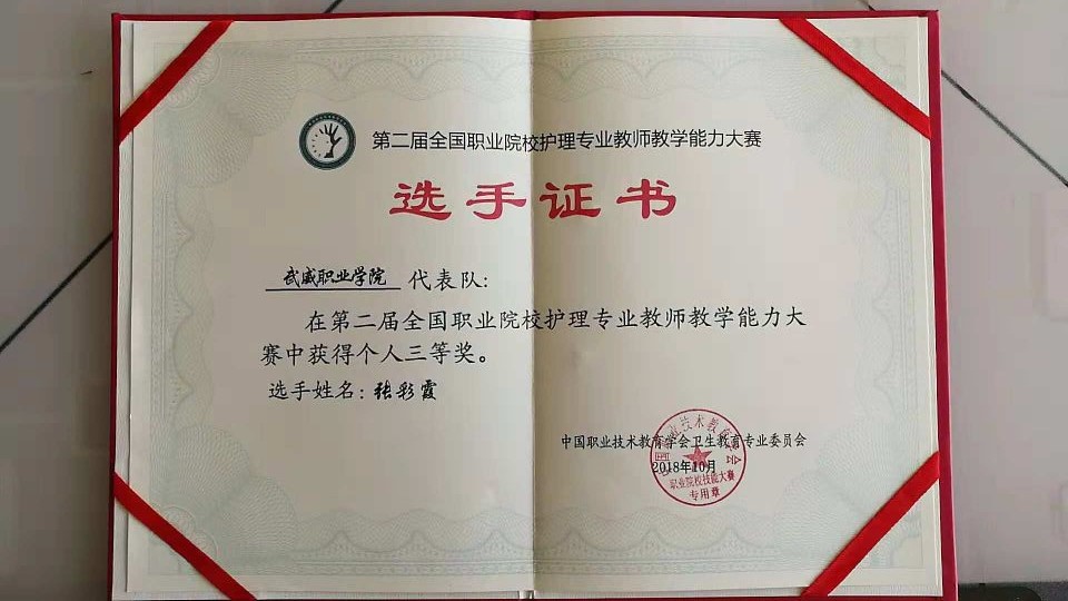 競賽共分為理論考核、說課程和臨床護理技能操作三個部分。其中,臨床護理技能操作部又分為三項,心肺復蘇術和靜脈輸液操作技術為必選項目,置胃管技術和氣管切開護理技術為抽選項目。經(jīng)過三天緊張激烈的比拼,通過了全部考核內容的綜合評定,最終張彩霞老師獲得了三等獎。