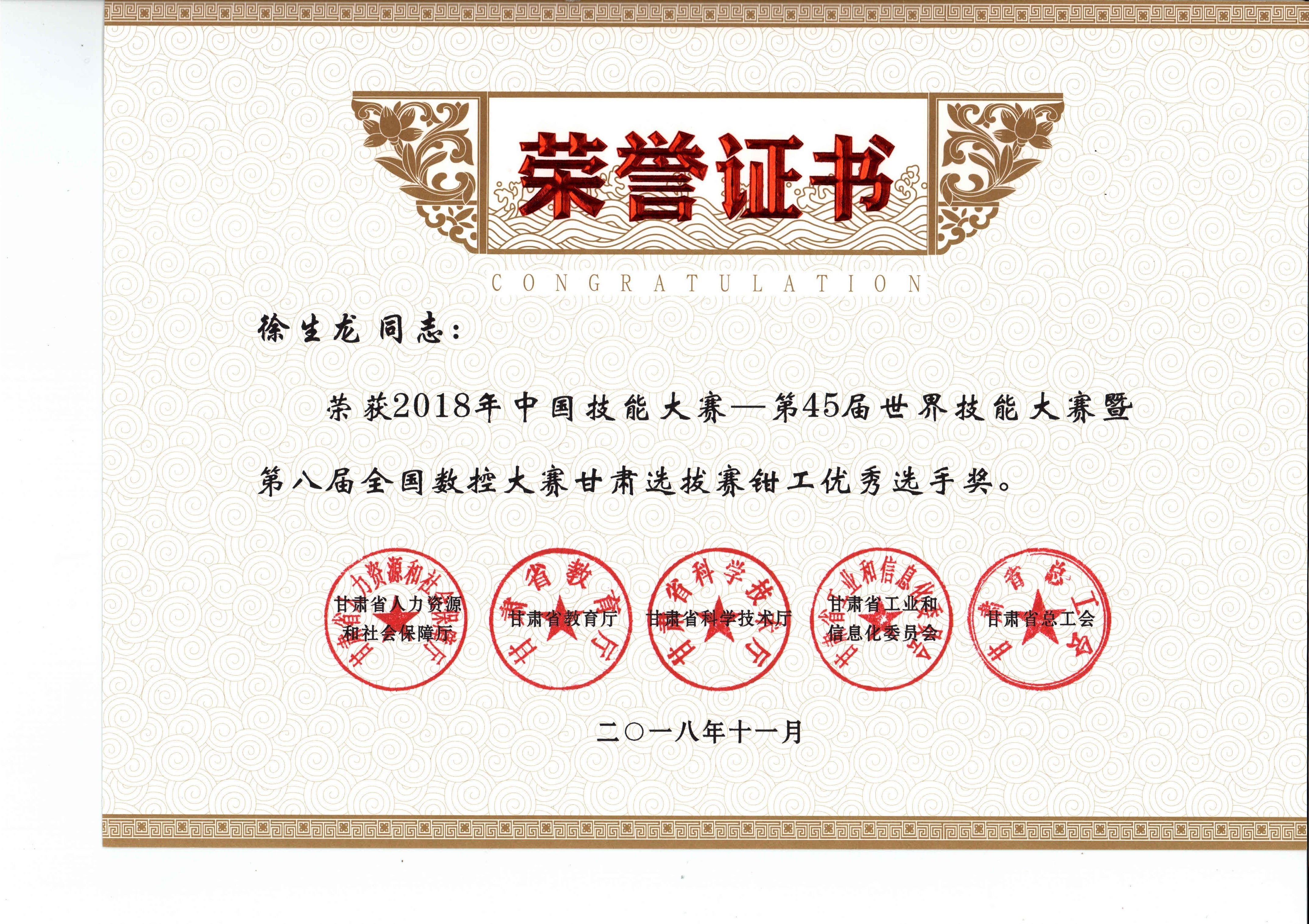 2018年中國(guó)技能大賽--第45屆世界技能大賽暨第八屆全國(guó)數(shù)控大賽甘肅選拔賽(鉗工項(xiàng)目)獲獎(jiǎng)證書