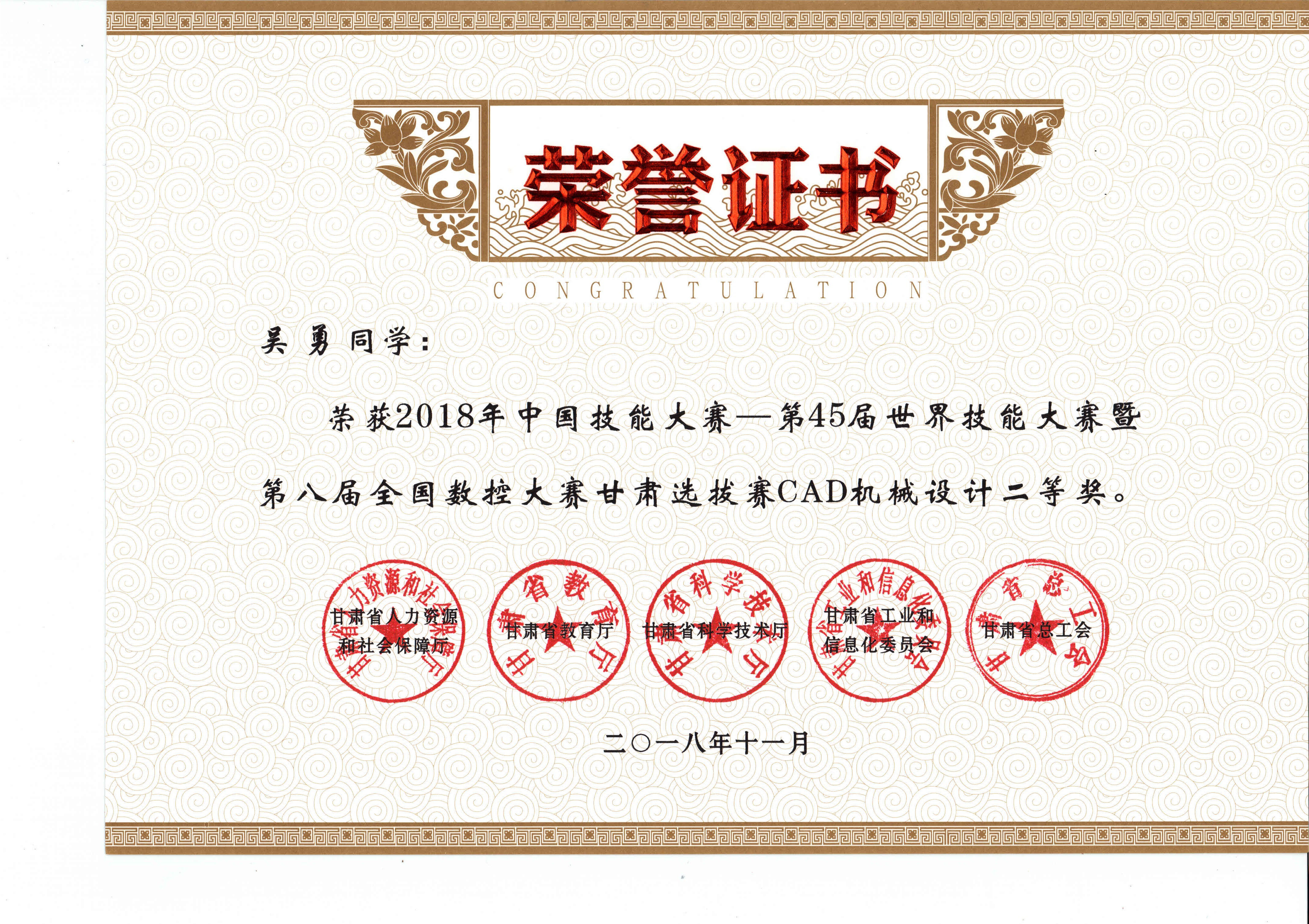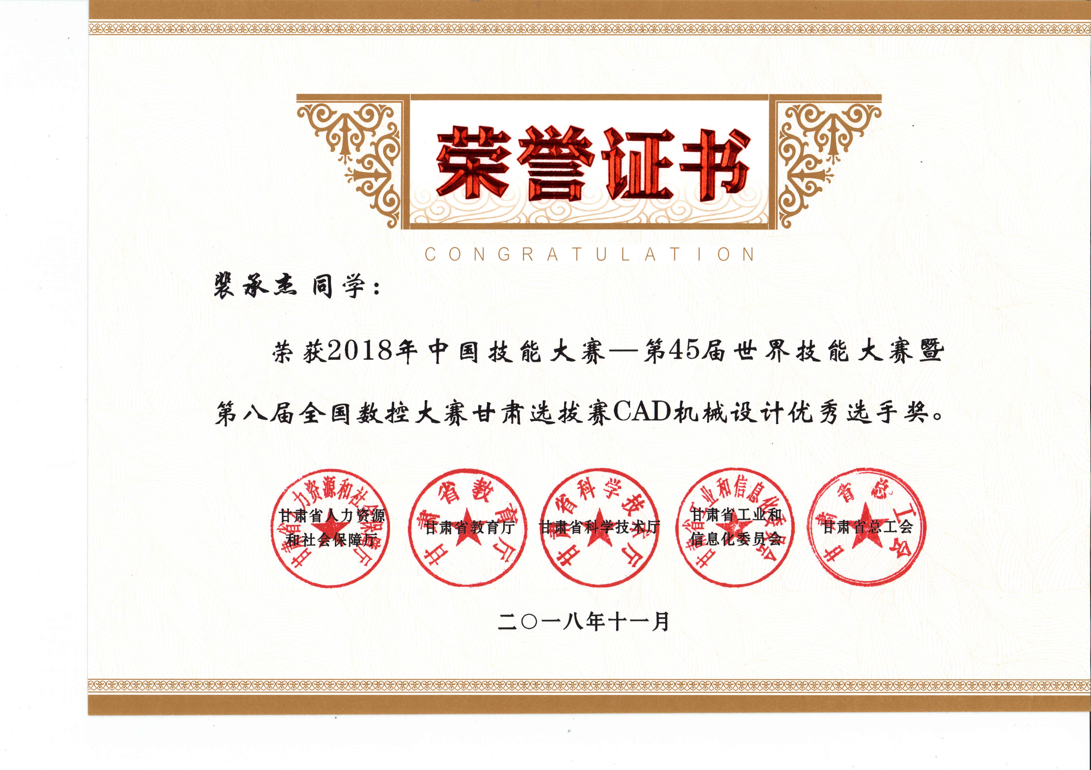 2018年中國(guó)技能大賽--第45屆世界技能大賽暨第八屆全國(guó)數(shù)控大賽甘肅選拔賽(CAD機(jī)械設(shè)計(jì)項(xiàng)目)獲獎(jiǎng)證書(shū)