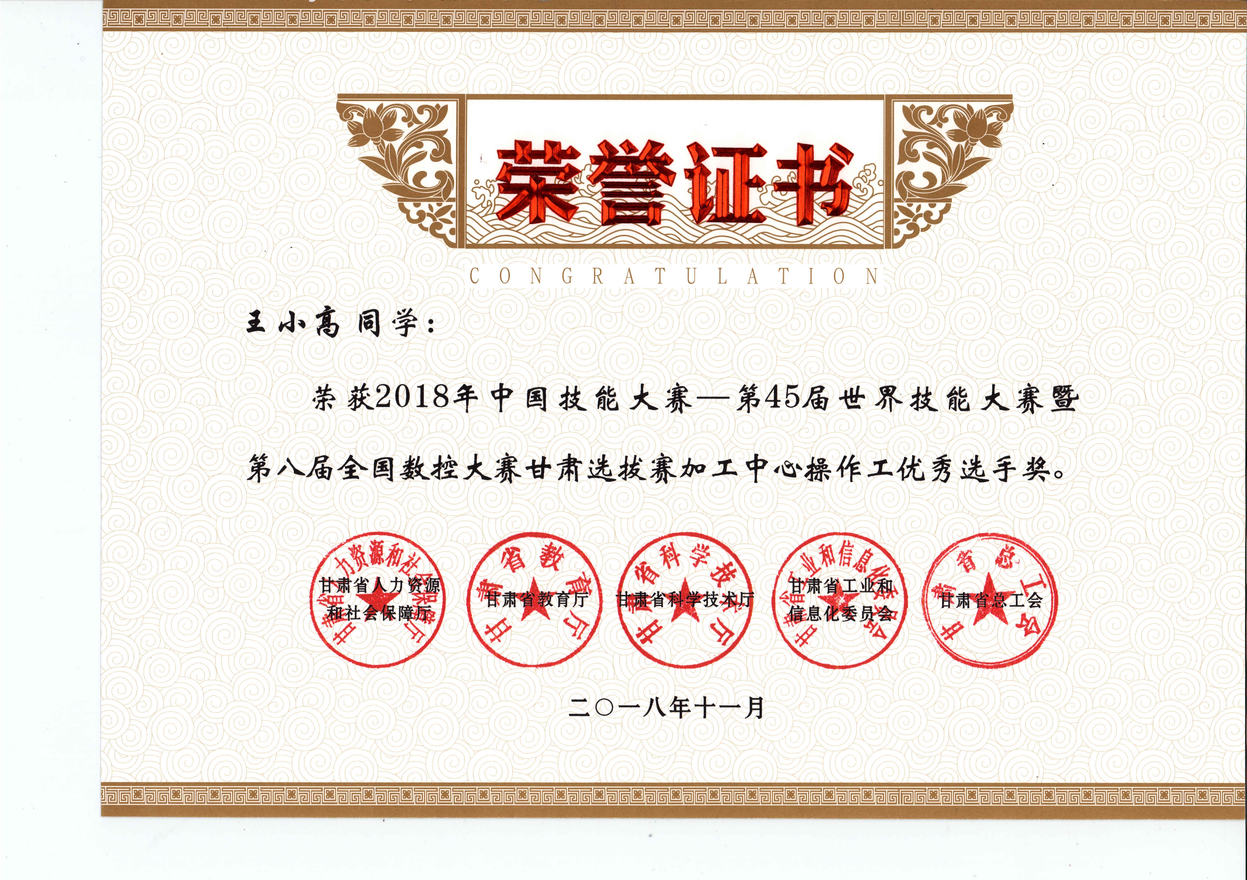 2018年中國(guó)技能大賽--第45屆世界技能大賽暨第八屆全國(guó)數(shù)控大賽甘肅選拔賽(加工中心項(xiàng)目)獲獎(jiǎng)證書(shū)