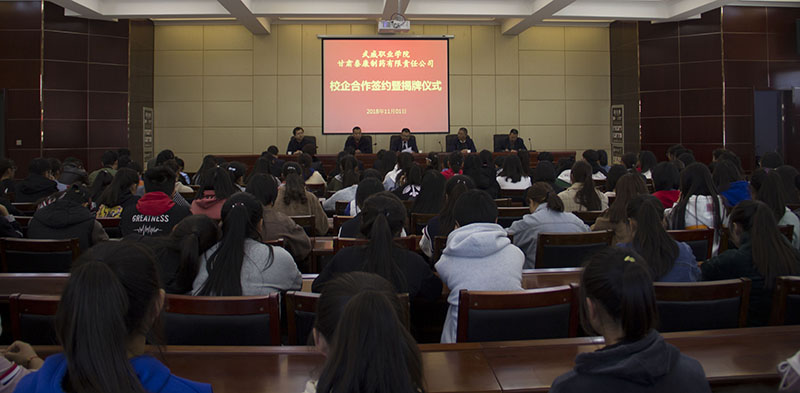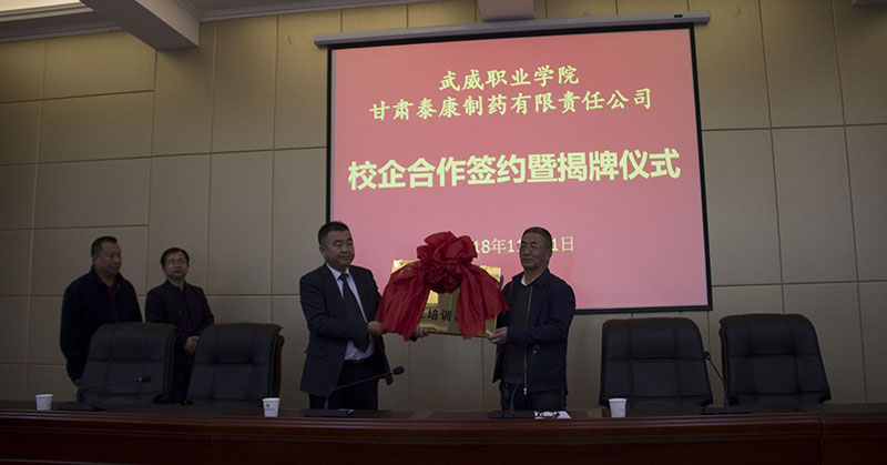 為提高人才培養(yǎng)質量和辦學水平,加強校企協(xié)同育人機制建設,11月1日下午,藥學系與甘肅泰康制藥有限責任公司校企合作共建“就業(yè)實習基地”簽約揭牌儀式在行樹樓北側會議室隆重舉行。甘肅泰康制藥有限責任公司投資方—北京久朝集團產業(yè)中心總監(jiān)楊宏超、公司總工程師毛著鴻、財務總監(jiān)郝敏等企業(yè)領導出席本次儀式。學院教務處處長仲生仁、招生就業(yè)處處長蔡柱山、藥學系主任魏潤明、副主任楊建美、黨總支副書記單光年及藥學系160余名師生參加了此次簽約揭牌儀式。儀式由魏潤明主持。