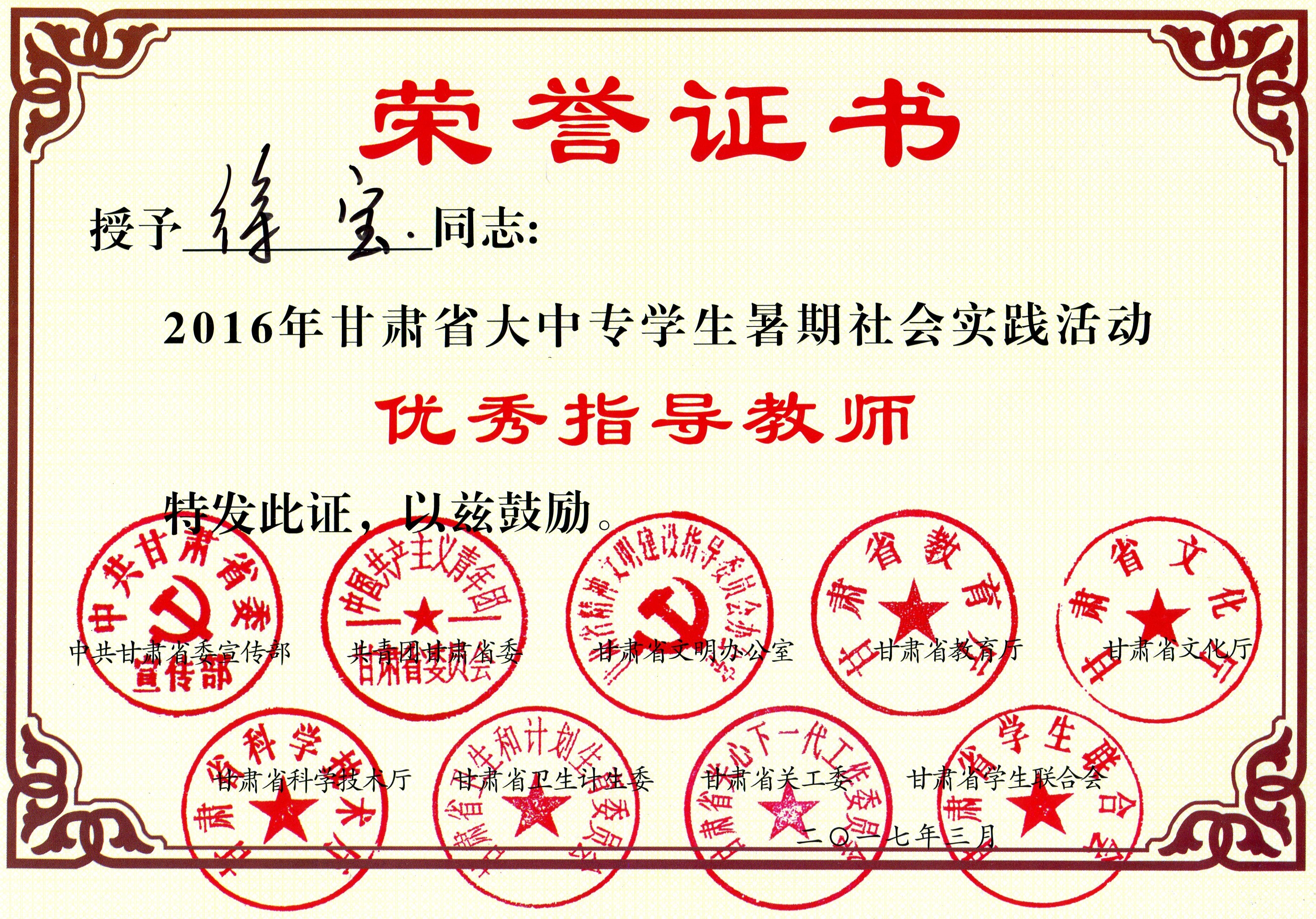 甘肅省大中專學生暑期社會實踐活動優(yōu)秀指導教師