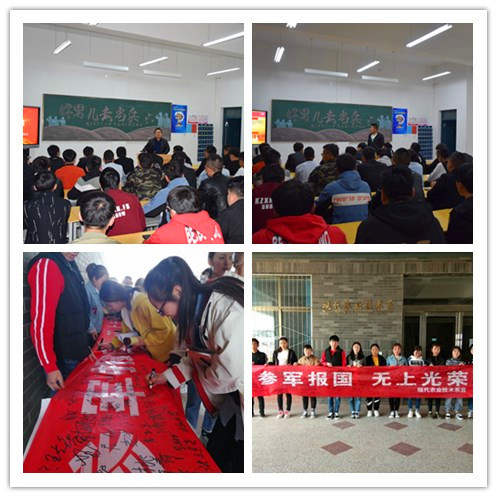 首先蔡海老師向同學(xué)們細(xì)致地講解了今年的征兵條件、報(bào)名方法及相關(guān)優(yōu)待政策,深入宣傳依法服兵役的積極意義,鼓勵(lì)適齡青年積極報(bào)名應(yīng)征,報(bào)效祖國。同時(shí)邀請2017級設(shè)施農(nóng)業(yè)與裝備大專班趙文文同學(xué)做了個(gè)人事跡匯報(bào)。該生曾在陸軍某部服役,現(xiàn)光榮退伍,回校就讀。交流中,他鼓勵(lì)同學(xué)們要敢于有夢、敢于追夢、敢于圓夢,讓青春在軍營的歷練中、在為祖國的奉獻(xiàn)中閃光。他還生動的講述了部隊(duì)的生活和訓(xùn)練情況,這段經(jīng)歷使他收獲了遠(yuǎn)大的理想信念,培養(yǎng)了良好的行為習(xí)慣,練就了強(qiáng)健的身體,這些將會讓他終身受益。活動最后進(jìn)行了“參軍報(bào)國,無上光榮”主題簽名儀式。