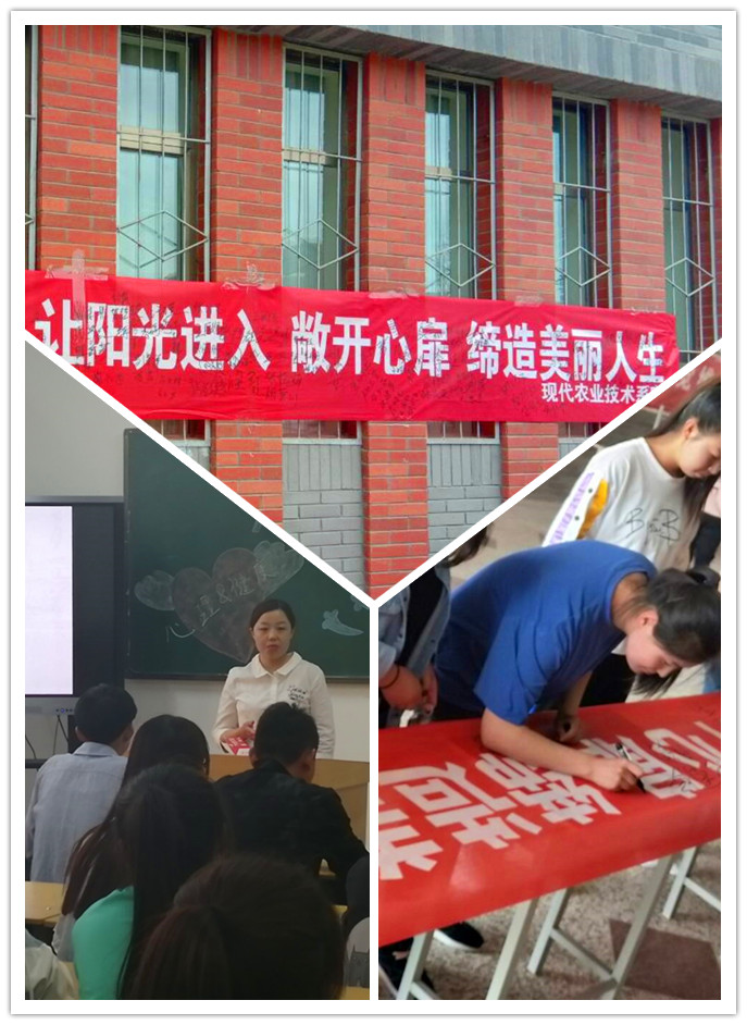 邀請現(xiàn)代農(nóng)業(yè)技術(shù)系張曉燕老師做了題為《預(yù)見未知的自己》的講座;系團學(xué)會組織學(xué)生參加“打開心靈的窗戶,讓陽光進入;敞開心扉,締造美麗人生?!敝黝}簽名活動。各班召開心理健康主題班會、開展心理游戲和手抄報活動。
