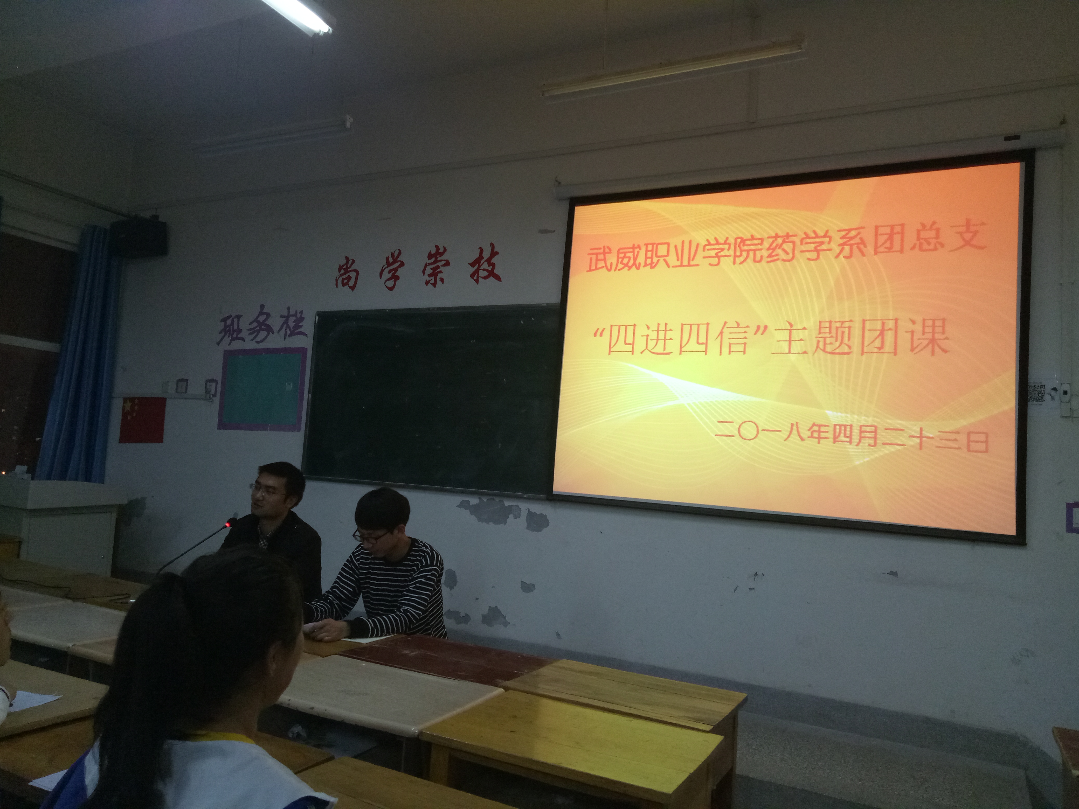 為深入學習宣傳貫徹習近平新時代中國特色社會主義思想,堅持以習近平新時代中國特色社會主義思想武裝團員干部和團員青年學生頭腦,積極推進各項工作開展。2018年4月23日晚,藥學系團總支組織16級團員青年及17級入團積極分子在明遠樓501教室開展關(guān)于“四進四信”的主題團課活動,團課由系團總支書記陳輝生主持。