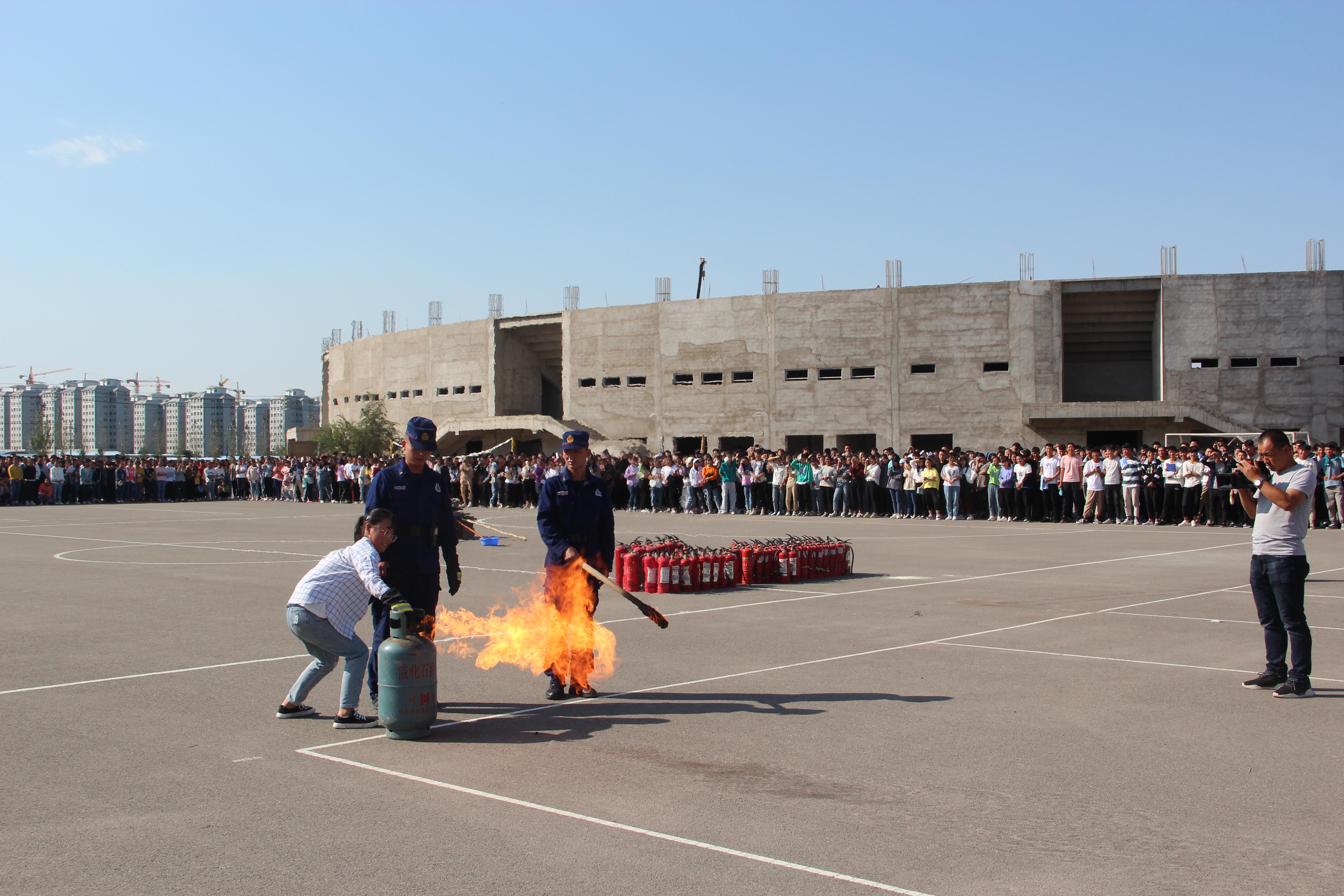 隨后,2019級(jí)新生整隊(duì)到操場(chǎng)參加了滅火演練。在消防隊(duì)員的講解和示范下,同學(xué)們現(xiàn)場(chǎng)學(xué)習(xí)了應(yīng)急逃生和消防安全常識(shí),部分師生代表、食堂工作人員親身體驗(yàn)了處置滅火器著火液化氣瓶、干粉滅火、通過(guò)模擬煙室逃生等操作。