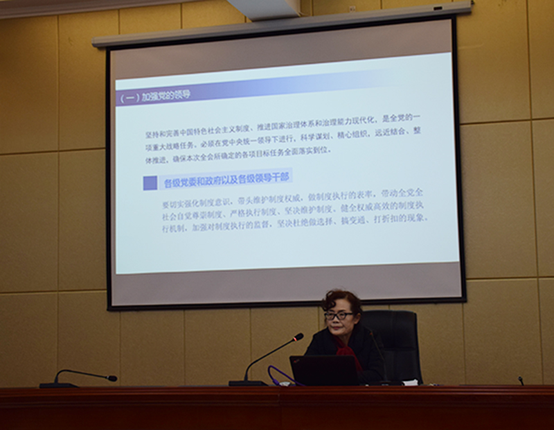 晏素珍以《中共中央關于堅持和完善中國特色社會主義制度推進國家治理體系和治理能力現(xiàn)代化若干重大問題的決定》的學習與解讀為題,重點就全會召開的背景、意義和看點;《決定》的基本框架和主要內(nèi)容以及抓好全會的學習貫徹的具體要求進行了宣講。要求廣大師生提高政治站位,樹牢“四個意識”,堅定“四個自信”,做到“兩個維護”,推動全會精神在全系落地生根、取得扎實成效。為實現(xiàn)“兩個一百年”奮斗目標,實現(xiàn)中華民族偉大復興的中國夢而努力奮斗。