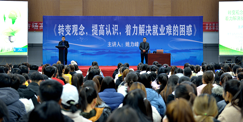 為貫徹2020屆全國普通高校畢業(yè)生就業(yè)創(chuàng)業(yè)工作網(wǎng)絡(luò)視頻會議精神,學(xué)院以習(xí)近平新時(shí)代中國特色社會主義思想為指導(dǎo),深入落實(shí)黨中央、國務(wù)院關(guān)于促進(jìn)高校畢業(yè)生就業(yè)創(chuàng)業(yè)的一系列重大決策部署,把畢業(yè)生就業(yè)工作擺在最突出位置,確保畢業(yè)生就業(yè)大局穩(wěn)定。12月14日上午,學(xué)院組織2020屆畢業(yè)生,在體育館參加了題為《轉(zhuǎn)變觀念,提高認(rèn)識,著力解決就業(yè)難得困惑》的專家講座,引導(dǎo)畢業(yè)生轉(zhuǎn)變觀念、積極就業(yè)。講座由省人社廳人力資源市場檔案管理部部長姚力峰主講,招生就業(yè)處副處長董鵬主持。