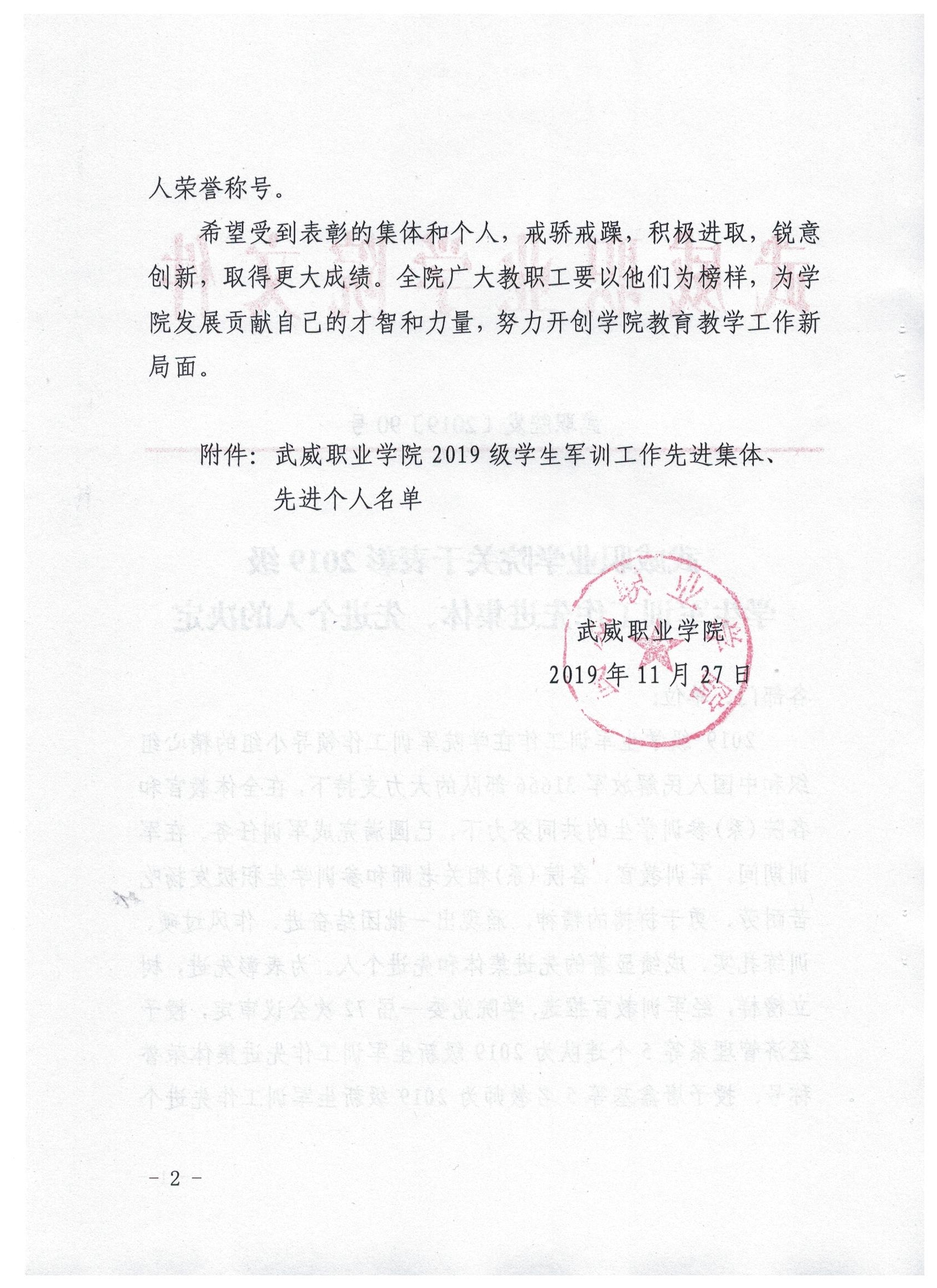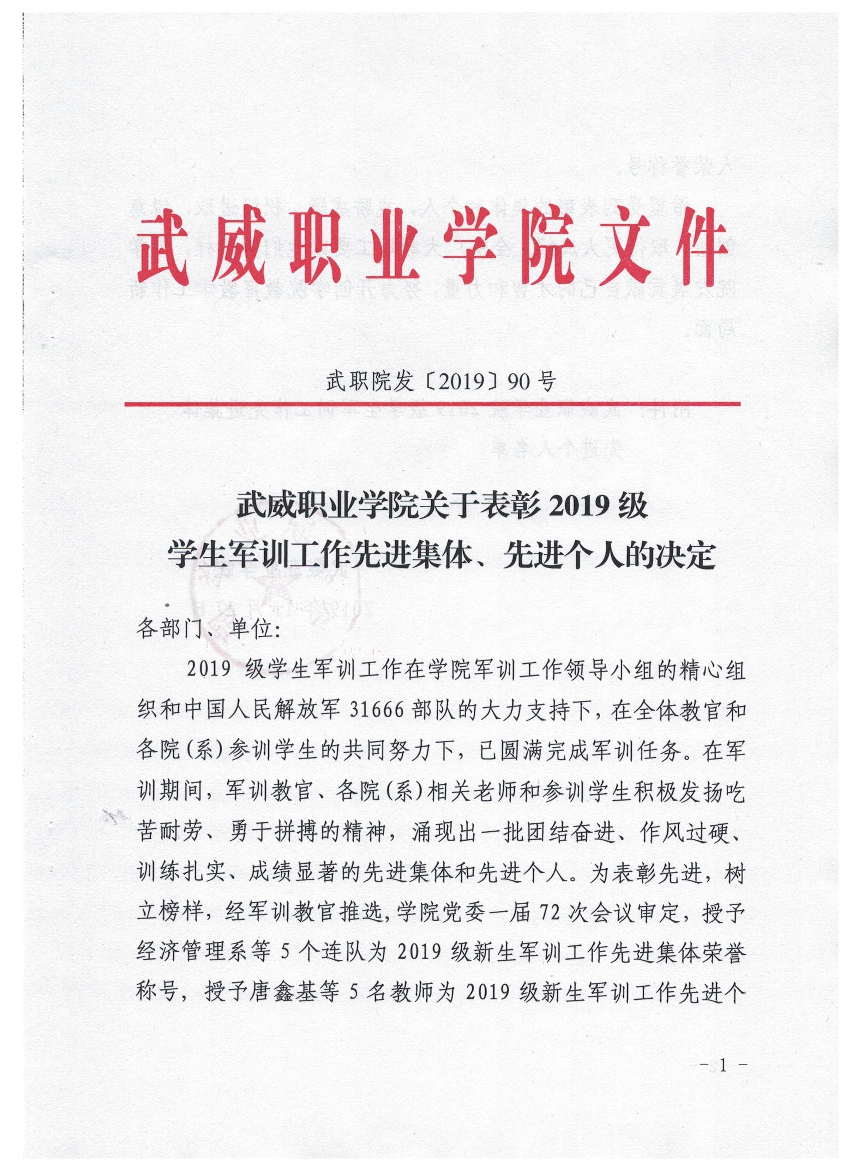 武威職業(yè)學院關于表彰2019級學生軍訓工作先進集體、先進個人的決定