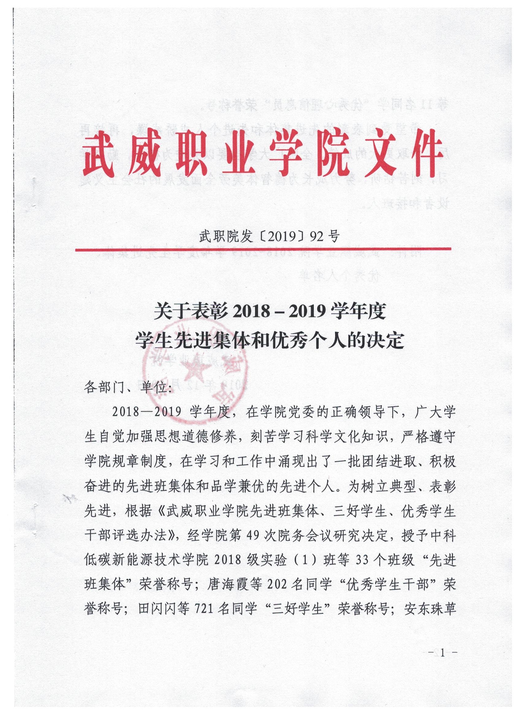關(guān)于表彰2018-2019學年度學生先進集體和優(yōu)秀個人的決定