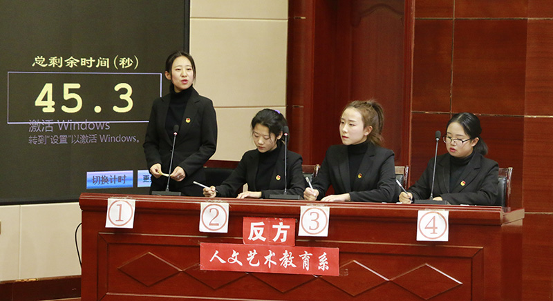經過四輪11場次的比賽,電子信息工程系代表隊和人文藝術教育系代表隊進入最后決賽。比賽現(xiàn)場,正方電子信息工程系代表隊和反方人文藝術教育系代表隊針對企業(yè)用人以“才”還是以“德”為先拉開激烈交戰(zhàn)。雙方選手在立論、駁立論、攻辯等各個環(huán)節(jié)中思路清晰,引經據典,字字珠璣,使現(xiàn)場氣氛迅速升溫。在自由辯論環(huán)節(jié)中,雙方選手就辯題展開更深層次的辯論,個個妙語連珠、你來我往、侃侃而談,場下掌聲連連。整場比賽高潮迭起,精彩不斷,觀眾也積極參與互動,現(xiàn)場氣氛十分活躍。經過激烈的角逐,人文藝術教育系代表隊表現(xiàn)更勝一籌,獲得本屆辯論賽冠軍,電子信息工程系榮獲本屆比賽亞軍,醫(yī)學技術與信息管理系榮獲季軍,能源工程系榮獲 “優(yōu)秀辯隊”,人文藝術教育系楊婉瑩、電子信息工程系楊曉紅和能源工程系萬寶紅3位同學榮獲 “最佳辯手”。