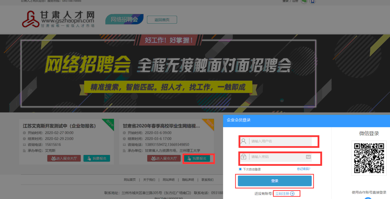 1.登錄甘肅人才網(wǎng)(www.gszhaopin.com),點擊菜單欄“招聘會”—“網(wǎng)絡招聘會”進入二級頁面菜單,進入網(wǎng)絡招聘會列表—選擇“武威職業(yè)學院2020屆醫(yī)藥衛(wèi)生類畢業(yè)生網(wǎng)絡視頻雙選會”點擊“我要報名”按鈕,登錄企業(yè)后臺(無賬號點擊“立即注冊”,資質(zhì)通過審核后再報名),待定審核。