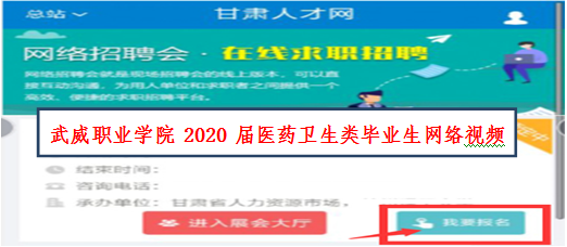 1.畢業(yè)生登錄甘肅人才網(wǎng)(www.gszhaopin.com),點擊菜單欄“招聘會”—“網(wǎng)絡招聘會”進入二級頁面菜單,進入網(wǎng)絡招聘會列表,點擊“武威職業(yè)學院2020屆醫(yī)藥衛(wèi)生類畢業(yè)生網(wǎng)絡視頻雙選會”標題或“進入展會大廳”按鈕進入網(wǎng)絡招聘會大廳。