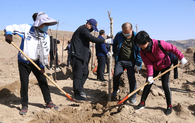 春風(fēng)吹拂處,新綠綻枝頭。為深入學(xué)習(xí)貫徹習(xí)近平總書記視察甘肅的重要講話和批示精神,認(rèn)真踐行綠水青山就是金山銀山的發(fā)展理念,實(shí)施綠色發(fā)展戰(zhàn)略,進(jìn)一步加強(qiáng)祁連山生態(tài)環(huán)境保護(hù)與治理,幫助幫扶鎮(zhèn)打贏脫貧攻堅(jiān)戰(zhàn),實(shí)施鄉(xiāng)村振興戰(zhàn)略,4月9日,學(xué)院領(lǐng)導(dǎo)班子成員、幫扶干部、駐村干部及部分教職工70多人深入結(jié)對幫扶鎮(zhèn)——黑松驛鎮(zhèn)開展義務(wù)植樹活動,建設(shè)“生態(tài)示范林”。春光沐浴的祁連山腳下黑松驛鎮(zhèn),春意盎然,生機(jī)勃勃,正是植樹好時(shí)節(jié)。廣大教職工一下車就拿起鐵鍬到植樹現(xiàn)場,與黑松驛鎮(zhèn)政府部分干部一起投入植樹活動,按照“橫看直線側(cè)一線、三埋兩踩一提苗”的技術(shù)要求,三人一組,分工協(xié)作,有序配合,揮鍬培土、扶苖踩土、圍堰澆水,現(xiàn)場一派熱火朝天的勞動景象。當(dāng)天植樹育林約20余畝,一棵棵新栽的樹苗整齊排列,迎風(fēng)挺立。通過義務(wù)植樹,廣大教職工用實(shí)際行動傳播著生態(tài)文明、綠色發(fā)展理念,切實(shí)幫助幫扶鎮(zhèn)綠起來,美起來,富起來。