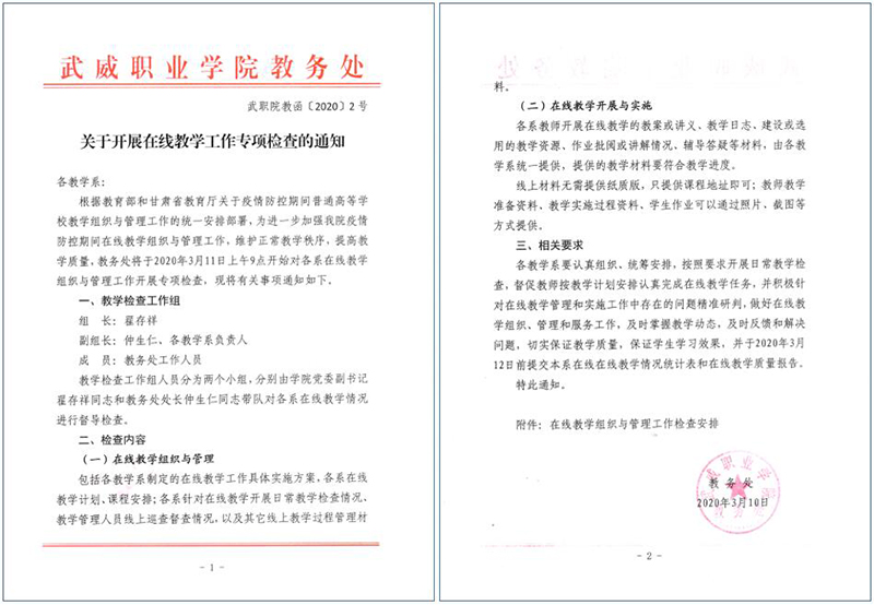 各院系及相關(guān)部門要按照教育部和省教育廳關(guān)于疫情防控期間在線教學(xué)工作的文件精神和《武威職業(yè)學(xué)院新型冠狀病毒肺炎疫情防控期間在線教學(xué)工作實施方案》的相關(guān)要求進(jìn)行全面自查,做到文件精神及要求全部落實到位、不打折扣;對執(zhí)行情況進(jìn)行認(rèn)真總結(jié),通過自查深入挖掘現(xiàn)階段在線教學(xué)實施和組織管理過程中的重點問題,利用各系教研活動和教研團(tuán)隊推動開展教學(xué)研究和人才培養(yǎng)模式改革研究,全面落實問題導(dǎo)向,推動在線教學(xué)工作落實落細(xì)落地。
