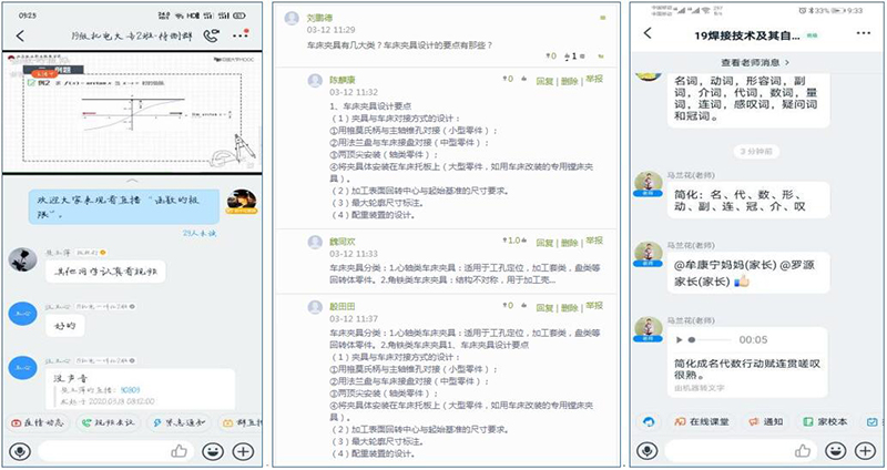 機(jī)械制造系和電信系的教師在課后積極收集學(xué)生的提問或者疑難問題,利用課余或周末的時間,在家中通過白板講解、紙筆講解的方式利用釘釘群直播講解練習(xí)題,開展互動答疑。
