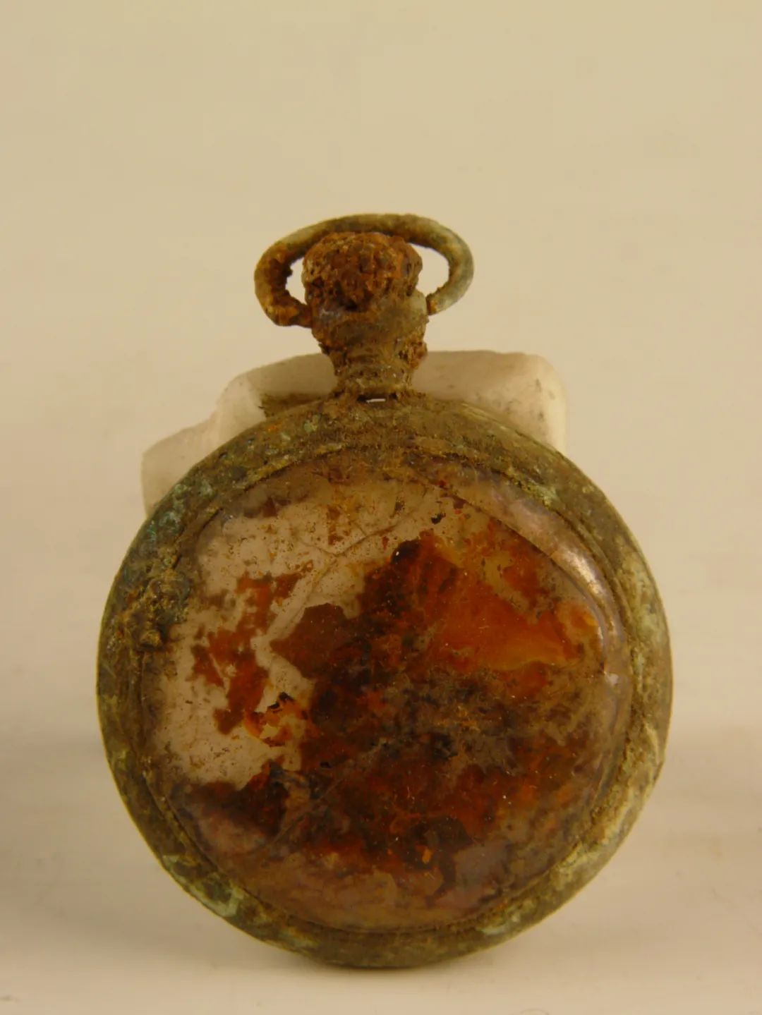 這只懷表于1971年從撫順平頂山慘案遺址出土,表蒙有明顯的裂痕,表盤內(nèi)已經(jīng)沒(méi)有指針。雖然銹蝕嚴(yán)重,但仍能看到被火燒過(guò)的痕跡。這只沒(méi)有指針的懷表,凝固了時(shí)間,也凝固了侵華日軍的滔天罪行。