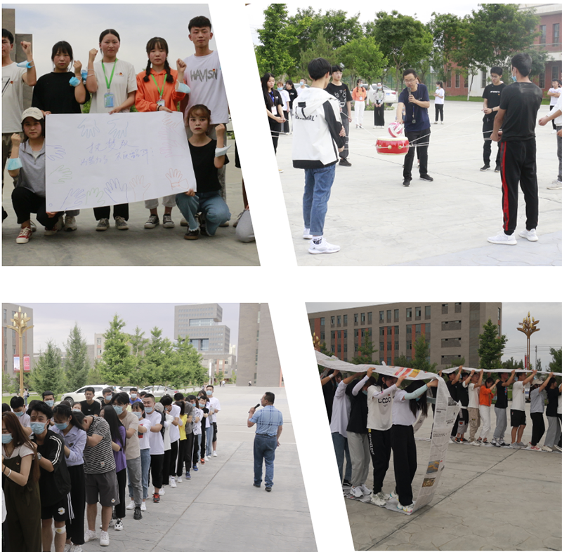 6月19日、6月20日下午在大學(xué)生活動(dòng)中心前廣場(chǎng)開(kāi)展“釋放壓力、放飛心靈”素質(zhì)拓展活動(dòng)。活動(dòng)包括破冰、團(tuán)隊(duì)建設(shè)、風(fēng)火輪大PK、同心協(xié)力創(chuàng)輝煌(鼓動(dòng)人心)、分享五個(gè)環(huán)節(jié)。