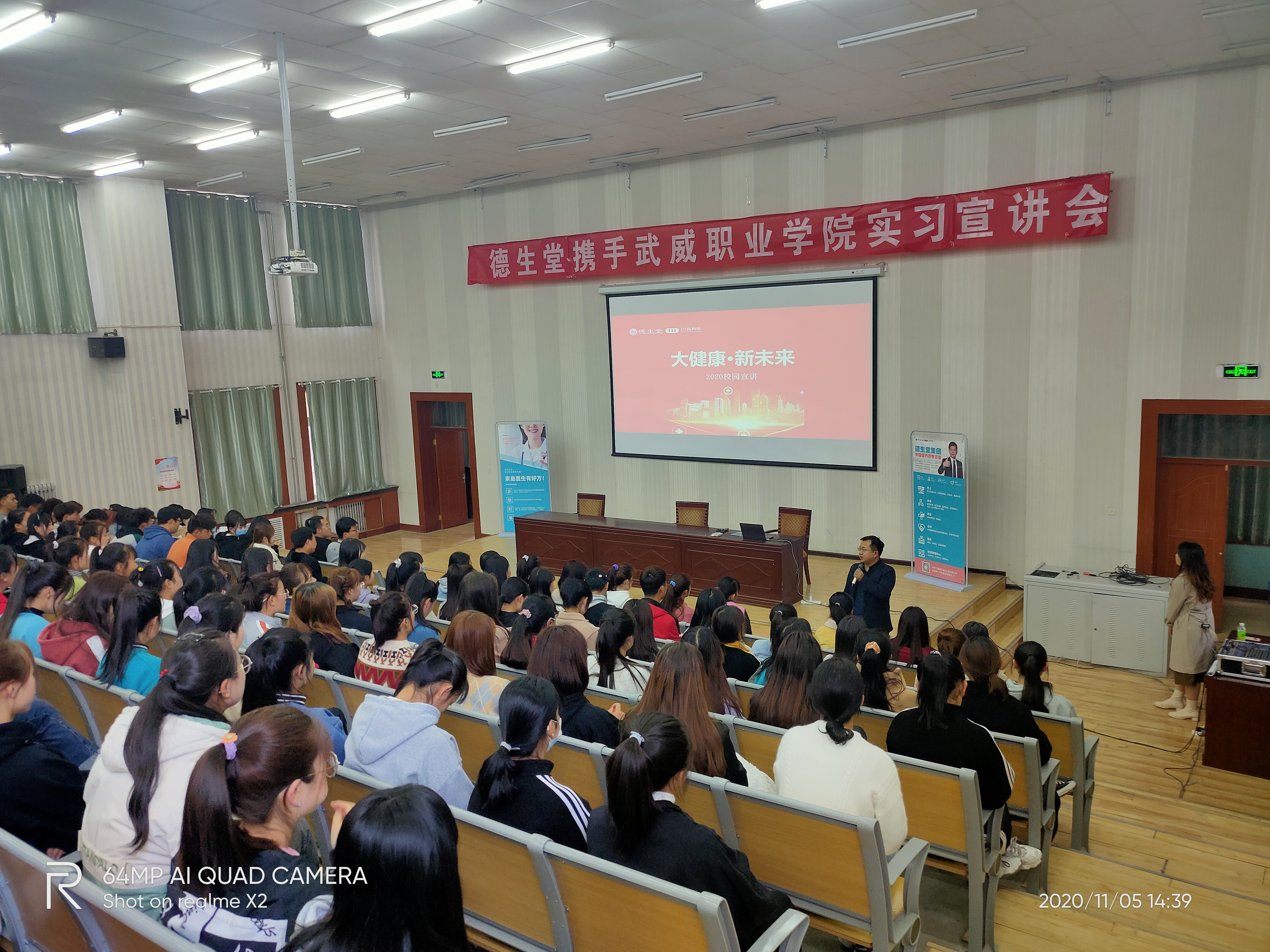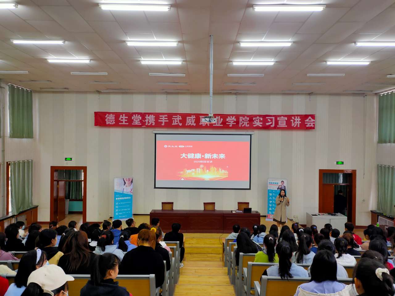 2020年11月5日,武威職業(yè)學(xué)院藥學(xué)系攜手德生堂在正德廳舉辦實習(xí)宣講會。藥學(xué)系黨總支書記、主任魏潤明、藥學(xué)系副主任楊建美、德生堂集團(tuán)武威區(qū)域經(jīng)理呂福英及2021屆172名畢業(yè)生參加宣講會。