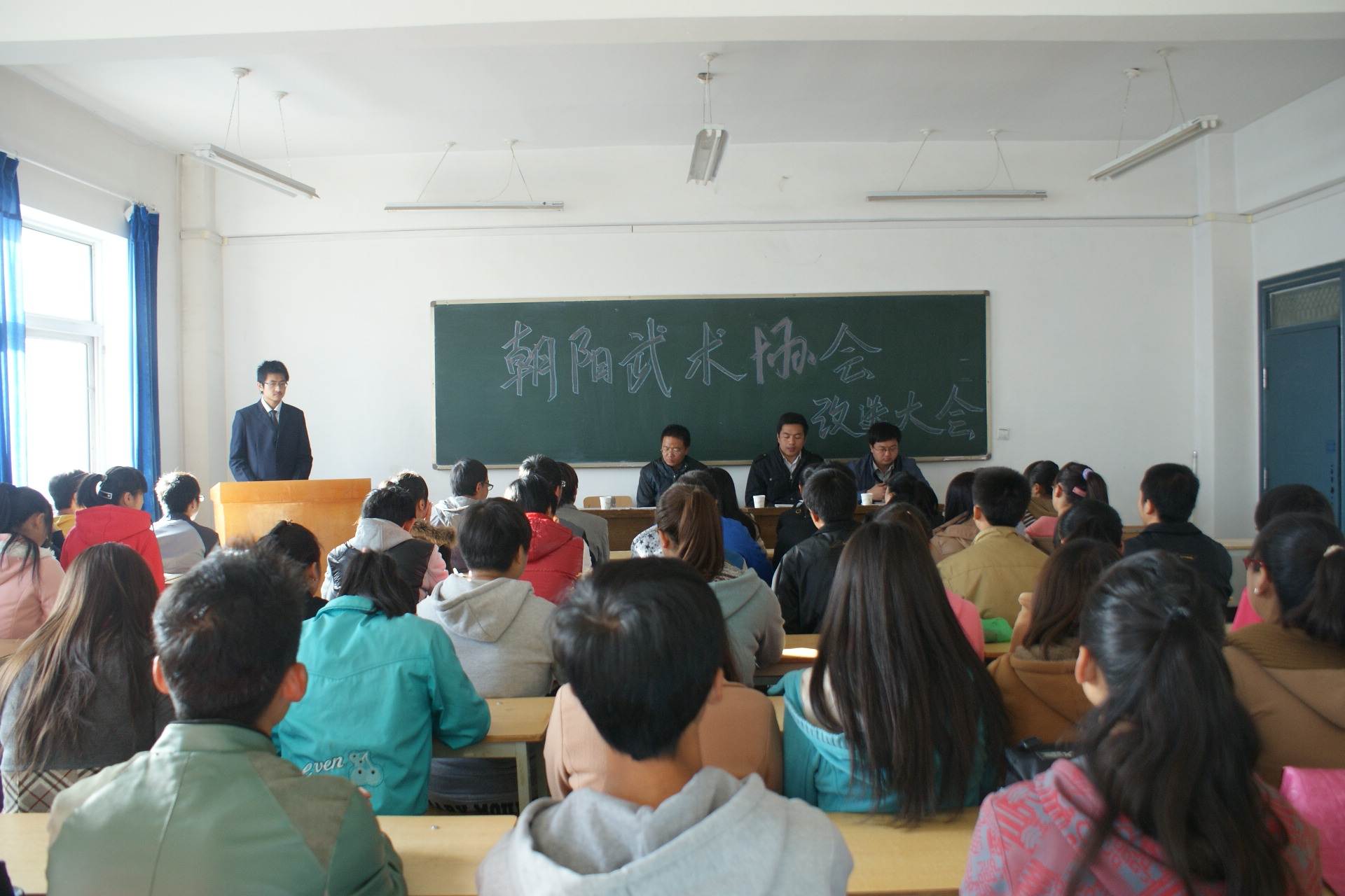 為了進(jìn)一步構(gòu)建校園和諧社團(tuán)文化,加強(qiáng)武術(shù)協(xié)會(huì)的自身建設(shè),不斷發(fā)展和完善武術(shù)協(xié)會(huì)的擴(kuò)招力,激發(fā)優(yōu)秀青年學(xué)生參與協(xié)會(huì)建設(shè)的熱情,11日2日上午9時(shí),由朝陽(yáng)武術(shù)協(xié)會(huì)自主承辦的社團(tuán)換屆大會(huì)在二號(hào)教學(xué)樓316教室如期舉行。