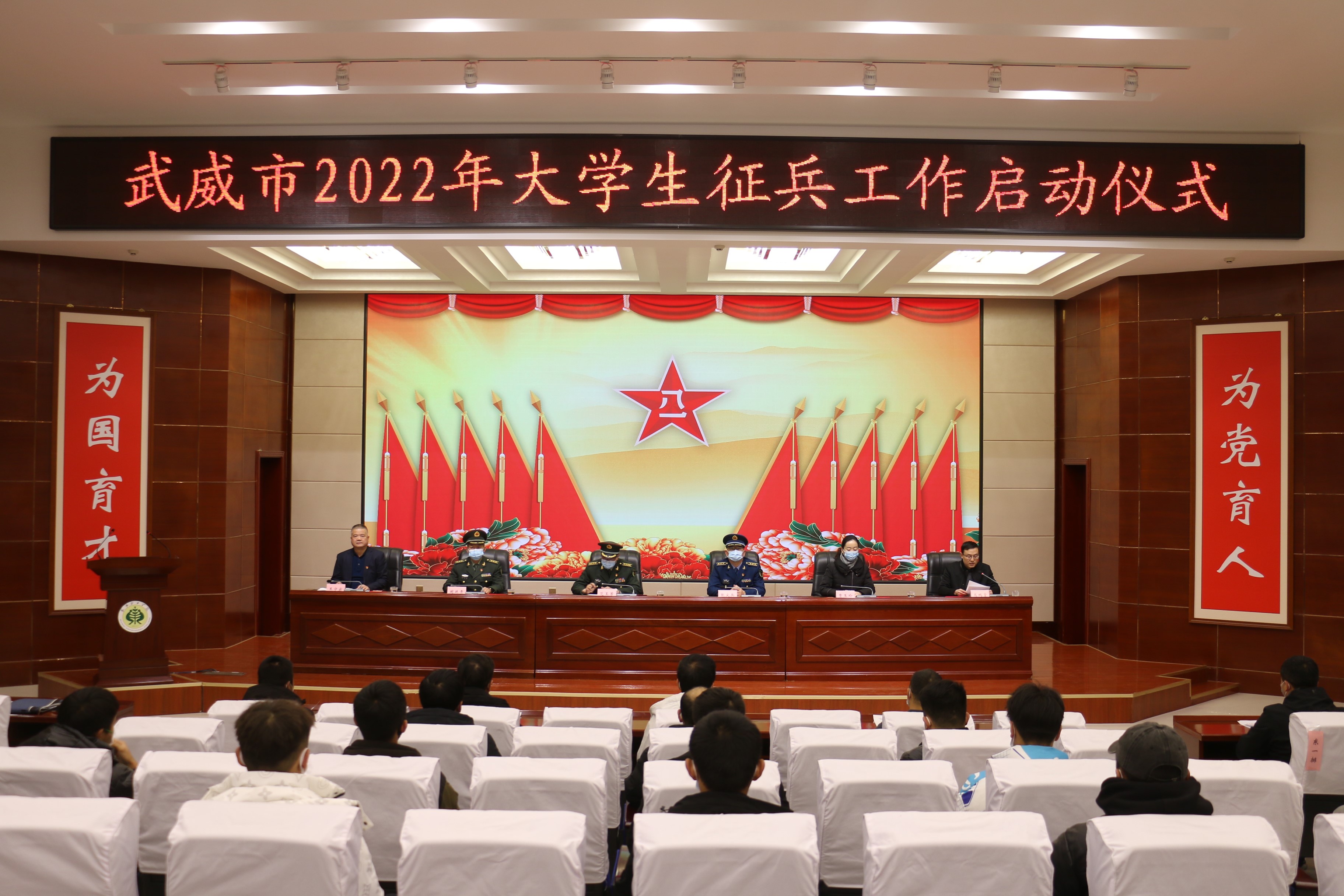 12月29日下午,武威市2022年大學(xué)生征兵工作啟動儀式在我院舉辦。武威軍分區(qū)司令員范玉芳、武威軍分區(qū)動員處處長張尖兵、武威市教育局副局長賈玉玲、涼州區(qū)人武部部長闞延貴,學(xué)院黨委委員、副院長王守云出席會議。學(xué)院各院系輔導(dǎo)員、2021年退役復(fù)學(xué)大學(xué)生代表和應(yīng)征報名學(xué)生代表參加了會議。會議由學(xué)生工作處負責人高鵬堂主持。會議采取線下進行和線上同步直播的方式召開。