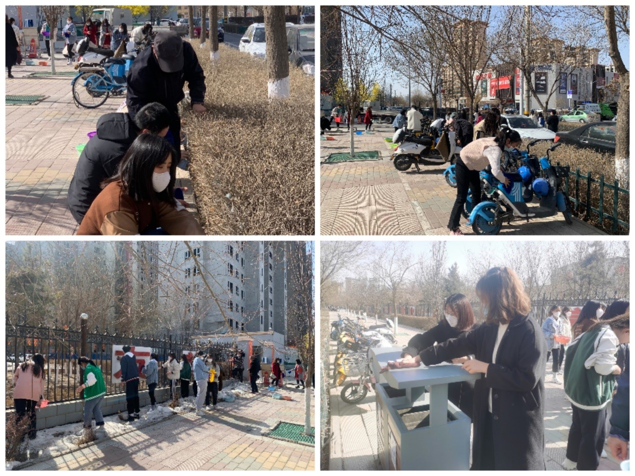 志愿者們來到學院北大門前學府路與皇臺路交叉十字至小北門道路兩側(cè),在主干道擦洗綠化帶隔離欄、校園柵欄、展示牌、垃圾箱,擺放共享單車,打掃衛(wèi)生,開展學雷鋒志愿服務(wù)主題活動。