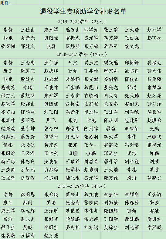 ???? 根據(jù)《甘肅省財政廳 甘肅省教育廳關(guān)于下達 2021年學生資助補助經(jīng)費(第二批)的通知》(甘財教〔2021〕68號)和《甘肅省學生資助資金管理辦法》(甘財教〔2022〕20號)文件要求,學生工作處擬對2019—2020學年符合資助條件的23名退役學生每人補發(fā)助學金3300元,共計75900元;對2020—2021學年符合資助條件的120名退役學生每人補發(fā)助學金3300元,共計396000元;對2021—2022學年符合資助條件的43名退役學生每人補發(fā)助學金3300元,共計141900元。現(xiàn)向廣大師生進行公示。
