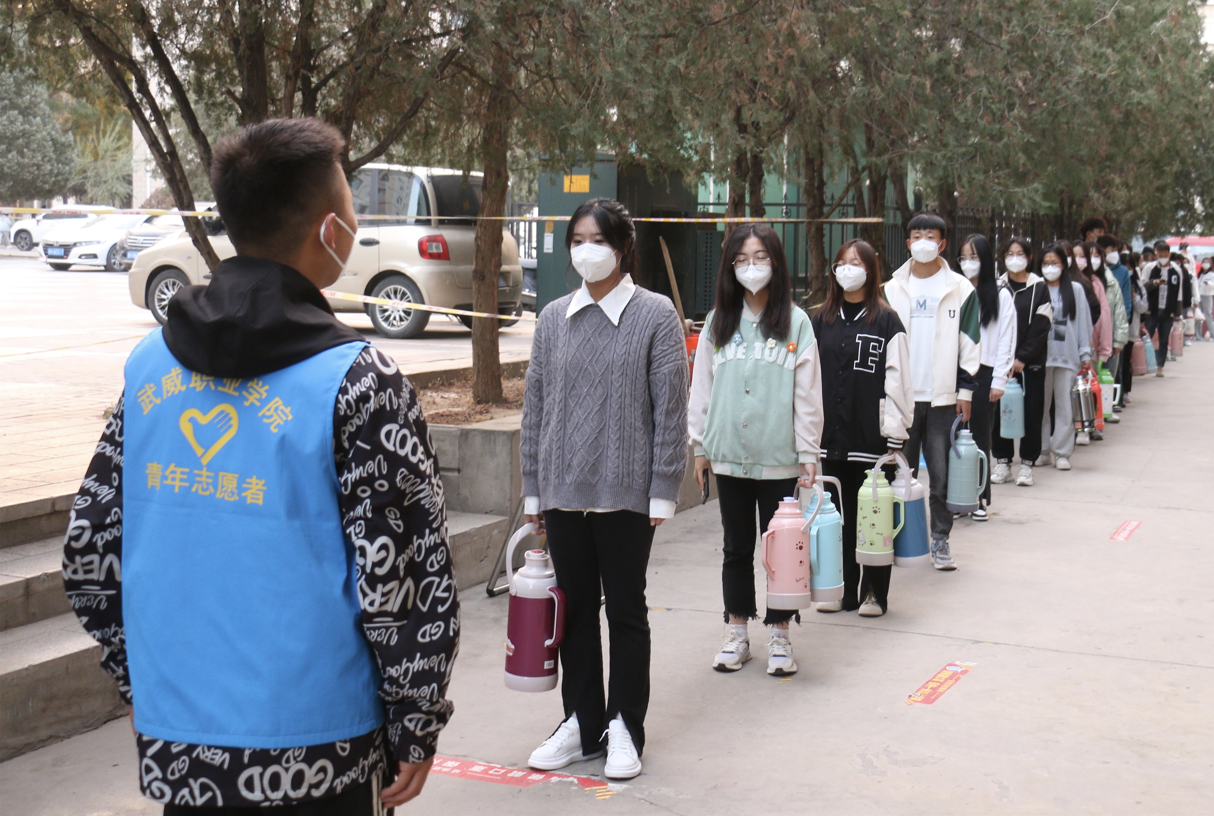 從學(xué)校實(shí)行最小單元宿舍管理開始,各學(xué)生組織工作人員分批次、不間斷、輪流值守,他們主動(dòng)亮身份、帶頭當(dāng)先鋒,在校園食堂、水房、超市等人流容易聚集的地方,每天安排志愿者在人流高峰時(shí)間段排班站崗,勸導(dǎo)同學(xué)們遵守疫情防控一米線,不扎堆不聚集,積極佩戴好口罩,做好個(gè)人防護(hù)工作,確保同學(xué)們吃飯、購物、打水健康有序進(jìn)行。在對可能傳入疫情的校園圍欄處開展值守勸阻工作,積極勸導(dǎo)學(xué)生不購買社會(huì)面商品,堅(jiān)決杜絕疫情從社會(huì)傳入校園,將學(xué)校疫情防控各項(xiàng)措施落細(xì)落實(shí),切實(shí)扛起校園疫情防控責(zé)任。一件件“藍(lán)馬甲”活躍在校園每個(gè)角落,服務(wù)同學(xué)的身影從未間斷,成為校園里一道靚麗的風(fēng)景線,用實(shí)際行動(dòng)詮釋了新時(shí)代武職學(xué)子的責(zé)任與擔(dān)當(dāng)。