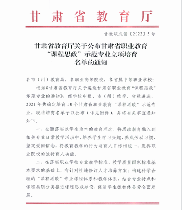? 近日,教育廳公布了2021年“技能甘肅”內(nèi)涵項(xiàng)目評審結(jié)果,中科低碳新能源技術(shù)學(xué)院申報的甘肅省職業(yè)教育“課程思政”示范專業(yè)、甘肅省職業(yè)教育在線精品課程、甘肅省職業(yè)教育名師工作室均獲評。
