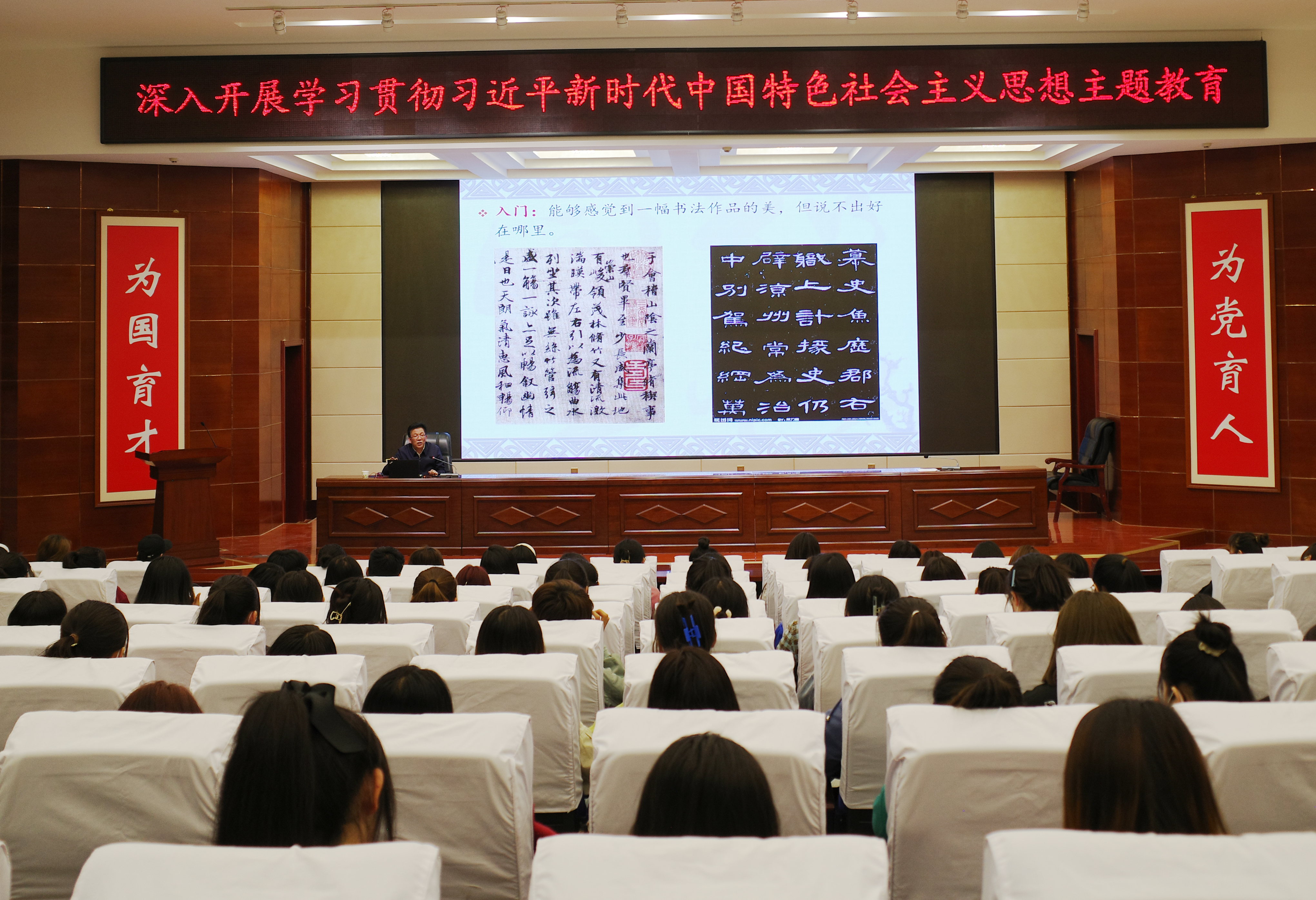 活動中,齊澤山在菁英廳為師生做了題為“如何欣賞書法作品”專題講座,他介紹了中國書法藝術(shù)的起源、傳統(tǒng)、特點,以《蘭亭序》《曹全碑》等多幅經(jīng)典書法作品為例,深入解析了書法藝術(shù)的魅力與內(nèi)涵,清晰呈現(xiàn)了中國書法悠久的歷史脈絡(luò),使師生們對中國書法藝術(shù)的起源與發(fā)展有了更加深刻地理解。講座引經(jīng)據(jù)典、風(fēng)趣幽默、親切自然,讓師生在輕松愉悅的氛圍中升華了對書法藝術(shù)的審美感受。師生們紛紛表示,此次講座是一次難得的學(xué)習(xí)機會,受益匪淺,對中國書法藝術(shù)有了更深入、更全面的了解。