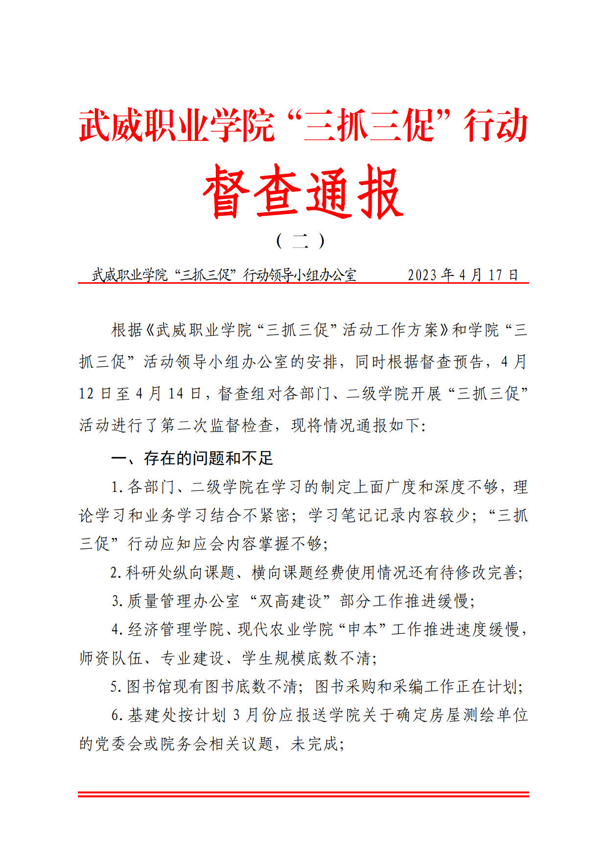 武威職業(yè)學(xué)院“三抓三促”行動督查通報(bào)( 二 )