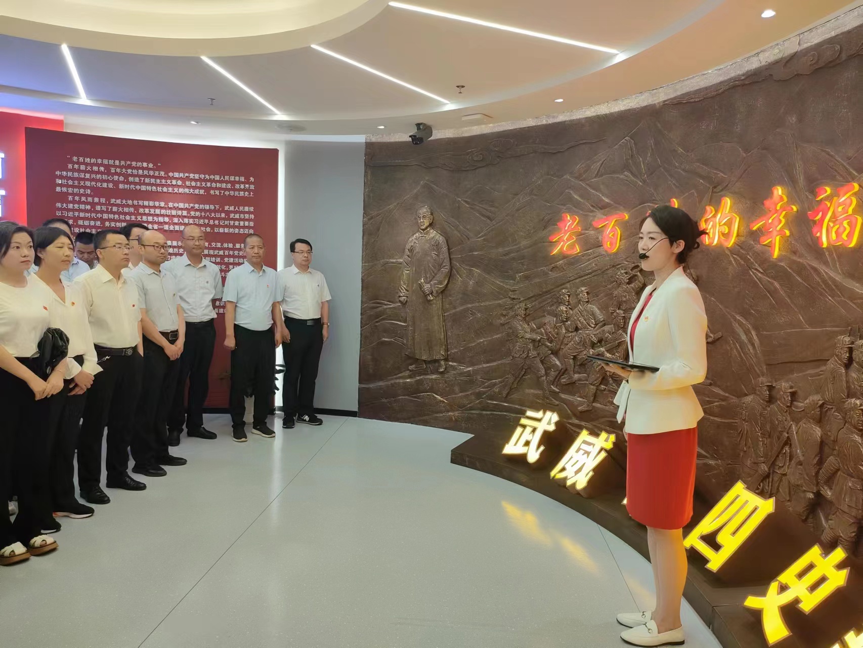全體黨員懷著崇敬的心情,在講解員的引導(dǎo)下,大家有序參觀了黨性教育基地序廳、主廳、智慧黨建廳、紅色文創(chuàng)廳、尾廳和初心講堂。一件件實物、一幅幅圖片、一段段故事,把大家?guī)Щ氐侥嵌尾憠验煹膷槑V歲月,共同追憶了武威發(fā)展的光輝歷程和紅色歷史,對武威發(fā)展的輝煌歷程有了更加深入的了解和認(rèn)識,對共產(chǎn)黨人的初心和使命有了更深刻的理解和感悟。在初心講堂,黨員們共同觀看紅色專題片《先鋒之光》,重溫中國共產(chǎn)黨人為了建設(shè)新中國拋頭顱、灑熱血的崢嶸歲月。