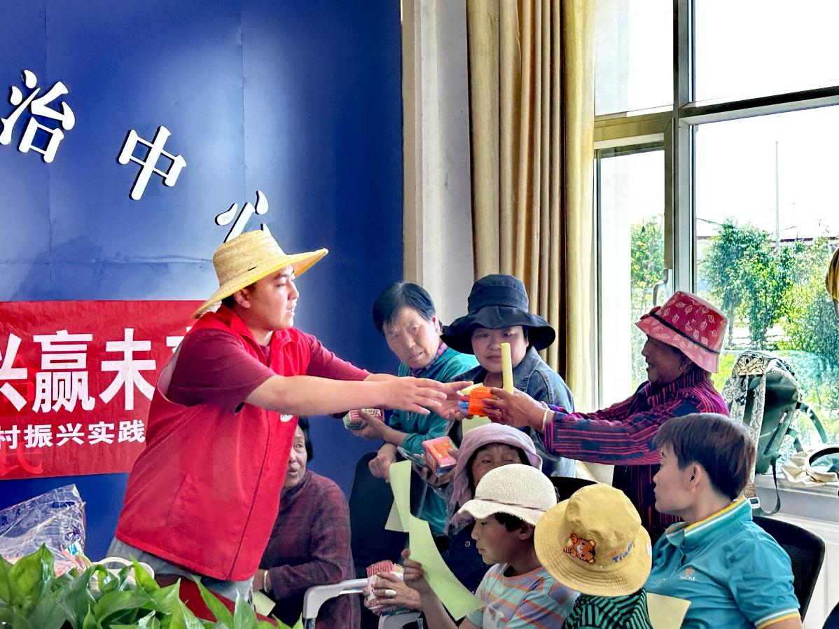 圖為實踐隊員為參與活動的婦女發(fā)放推普彩頁和物品