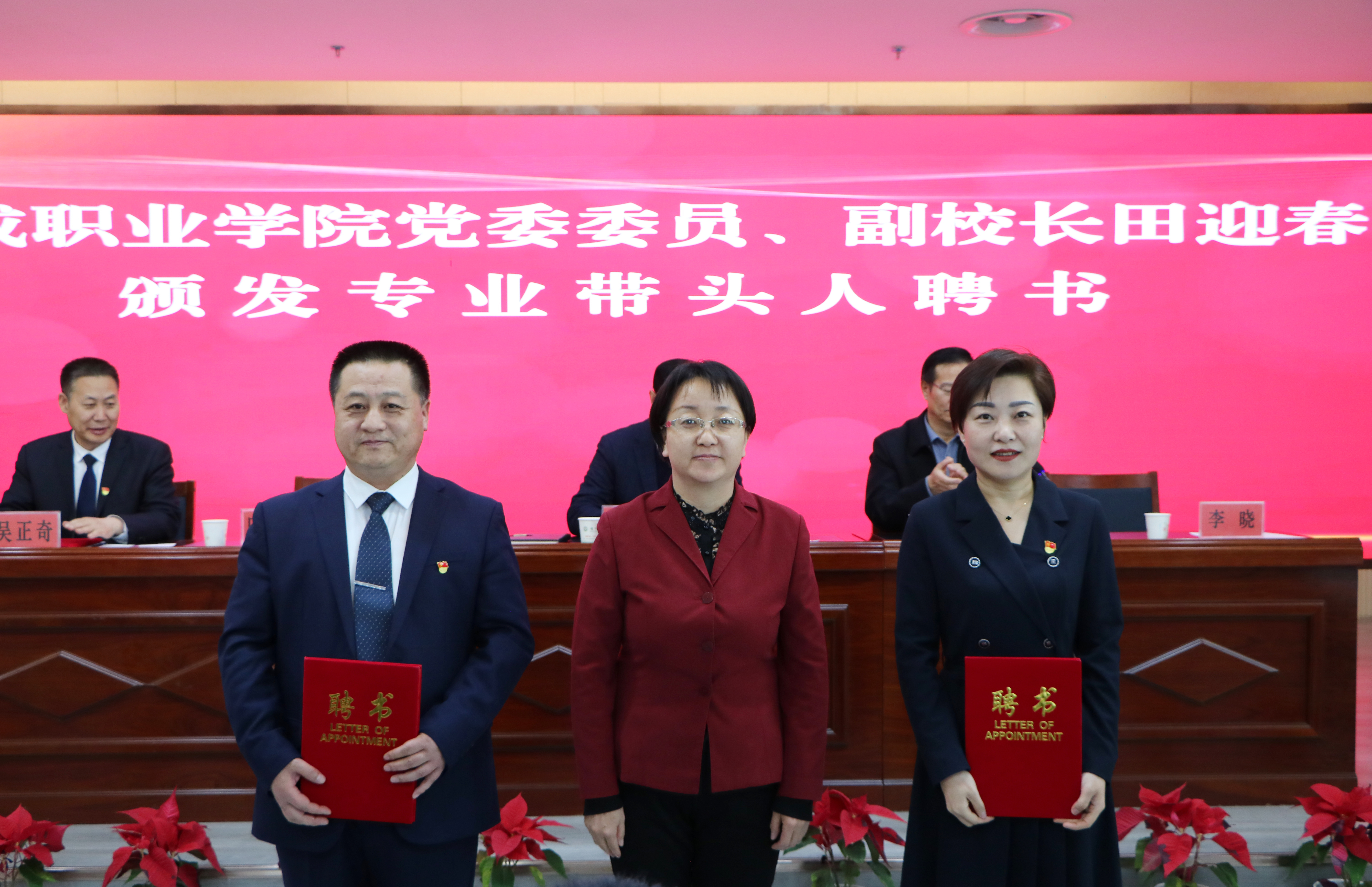 張開(kāi)禮宣讀了聘任文件。王宏、張開(kāi)禮和田迎春分別為特聘教授、客座教授和專業(yè)帶頭人頒發(fā)了聘書(shū)。