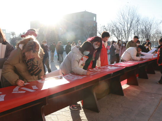 防艾知識(shí)宣傳志愿隊(duì)伍在大學(xué)生活動(dòng)中心廣場(chǎng)發(fā)放宣傳手冊(cè),制作并贈(zèng)送紅絲帶標(biāo)志400余個(gè),活動(dòng)中對(duì)300余名學(xué)生進(jìn)行了免費(fèi)艾滋病檢測(cè)。同學(xué)們一同在宣傳條幅上簽名,祝福語書滿了紅絲帶,一撇一捺、一筆一劃,都是無數(shù)的信念與期望的匯聚,是大家用無聲的行動(dòng)承諾自己防艾的決心。