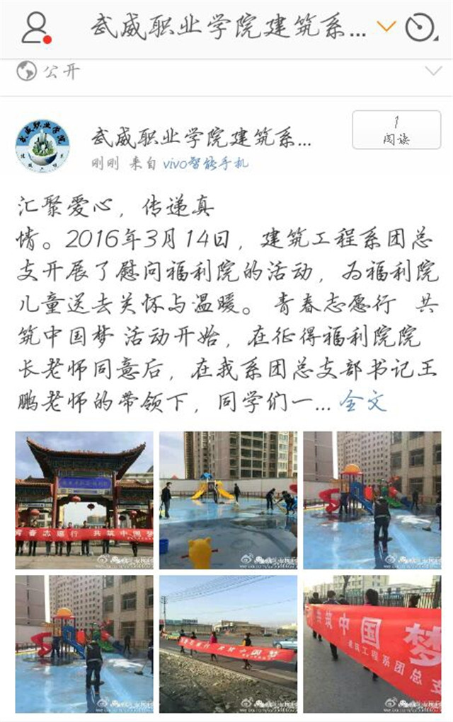 一是建筑系團(tuán)總支組織10名青年志愿者走進(jìn)武威社會福利院開展志愿服務(wù)活動。志愿者們走進(jìn)教室和孩子們聊天互動、做游戲,清掃、整理幼兒廣場,展示了我系志愿者的青春風(fēng)采,使孩子們和青年學(xué)生真正感受到雷鋒活在當(dāng)代、活在身邊。