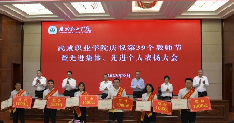 學校領(lǐng)導(dǎo)分別宣讀了《中共武威職業(yè)學院委員會關(guān)于表揚2023年教育工作先進集體和先進個人的決定》《武威職業(yè)學院關(guān)于認定(聘任)2023年“教書育人楷?!薄拔易钕矏鄣睦蠋煛薄敖虒W名師”“教學能手”“教學新秀”“骨干教師”“專業(yè)帶頭人”的決定》,向國獎獲獎團隊代表、優(yōu)秀教師代表頒發(fā)榮譽證書并發(fā)放慰問金。