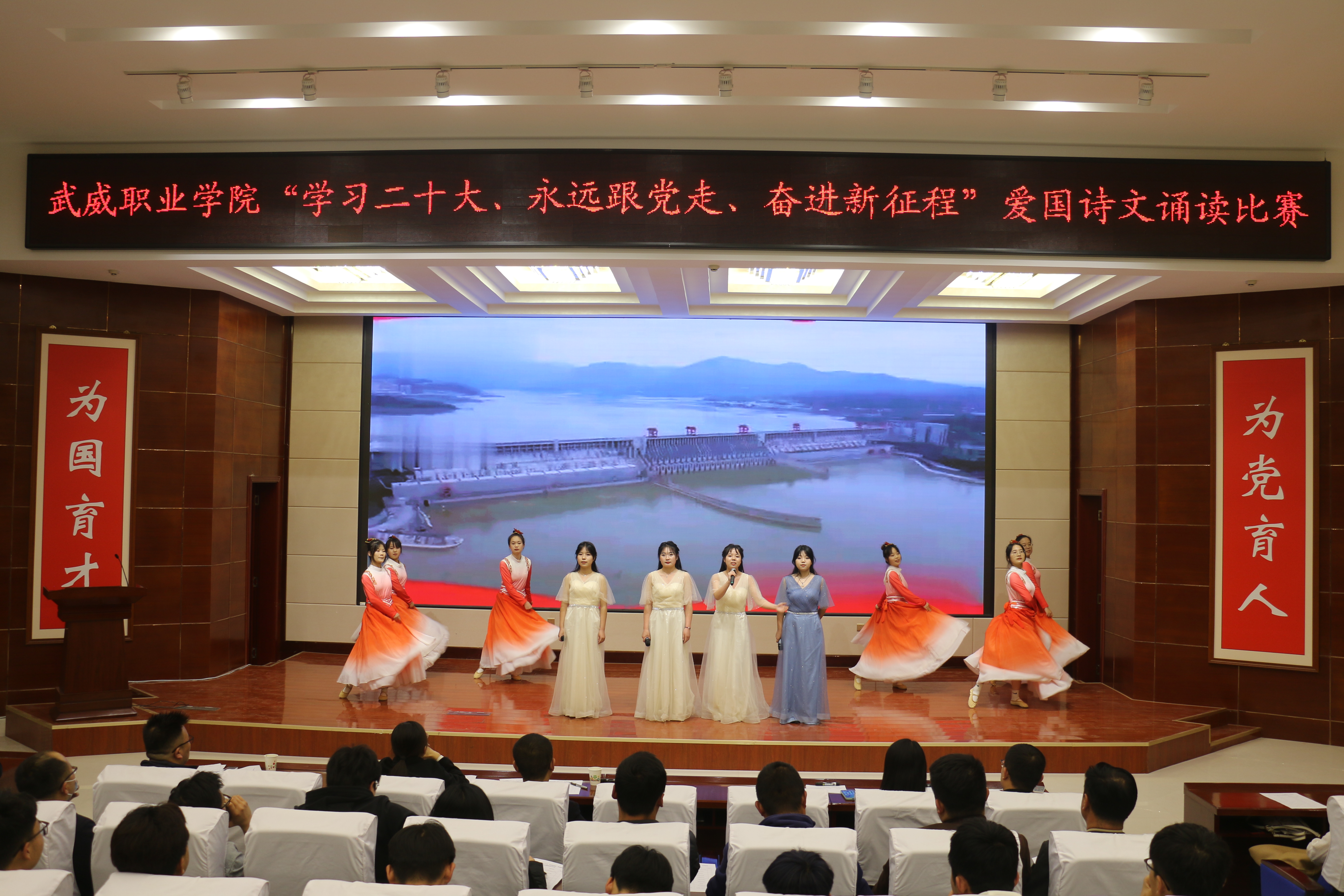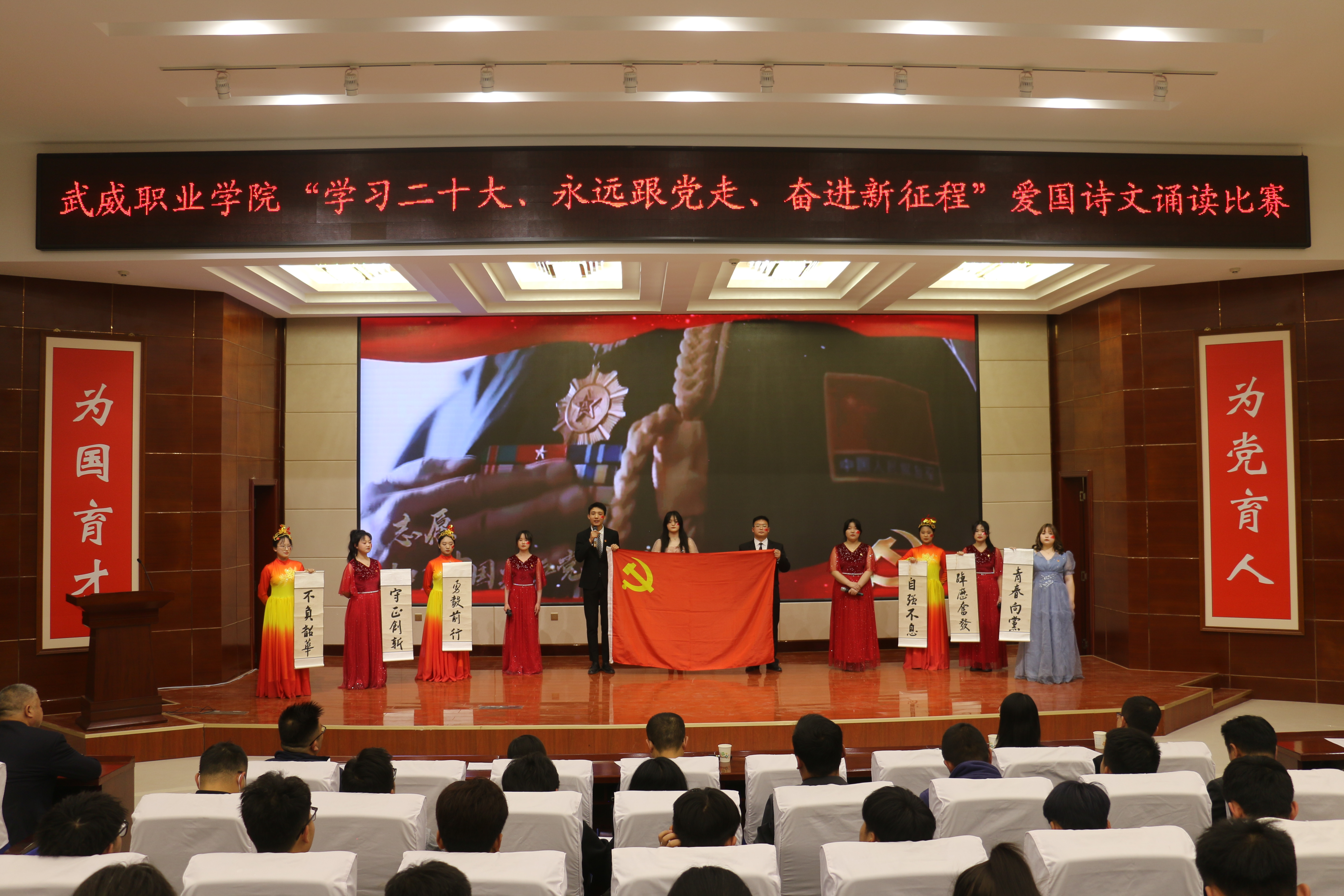 大賽于3月啟動(dòng),歷時(shí)一個(gè)月,各二級(jí)學(xué)院經(jīng)過(guò)初賽評(píng)比推選出9個(gè)優(yōu)秀節(jié)目入圍決賽。比賽現(xiàn)場(chǎng),各參賽隊(duì)以“學(xué)習(xí)二十大、永遠(yuǎn)跟黨走、奮進(jìn)新征程”為主題,將傳承經(jīng)典詩(shī)文和弘揚(yáng)愛(ài)國(guó)主義精神結(jié)合,誦詩(shī)抒情、借詞言志,熱情謳歌中國(guó)共產(chǎn)黨不懈奮斗的光輝歷程,全面展現(xiàn)新時(shí)代青年以夢(mèng)為馬,不負(fù)韶華的青春風(fēng)貌。校團(tuán)委原創(chuàng)編排表演的節(jié)目《追夢(mèng)八步沙,奮斗正青春》,深情動(dòng)人,感染全場(chǎng),歌頌了“六老漢”矢志艱苦奮斗的隴人品格,抒發(fā)了當(dāng)代青年永跟黨走,青春建功的豪情壯志。富余藝術(shù)感染力的經(jīng)典吟誦,穿插舞蹈、劇情和紅歌演唱,為廣大師生呈現(xiàn)了一場(chǎng)視聽(tīng)盛宴。