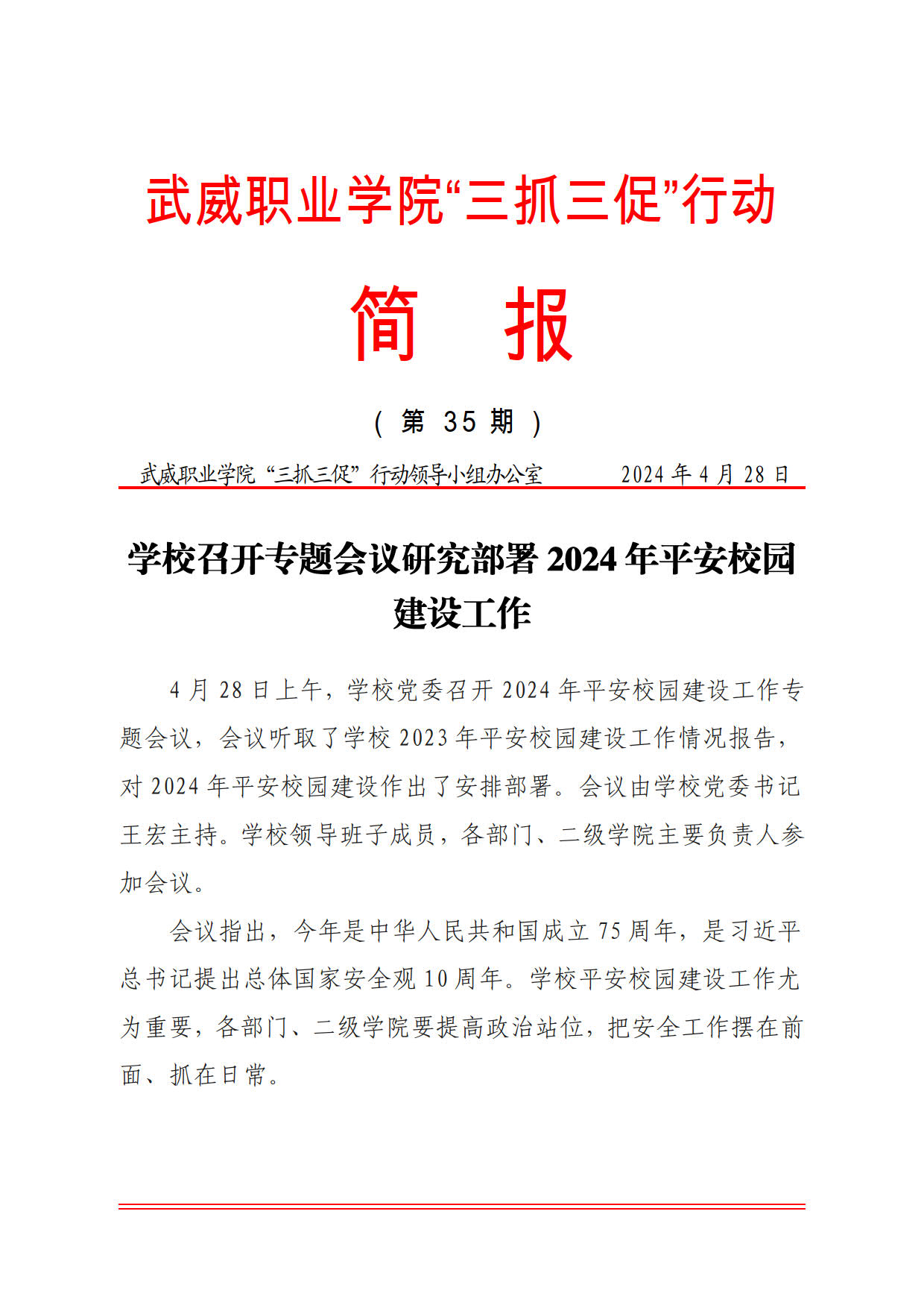 簡報(bào)第35期:學(xué)校召開專題會議研究部署2024年平安校園建設(shè)工作