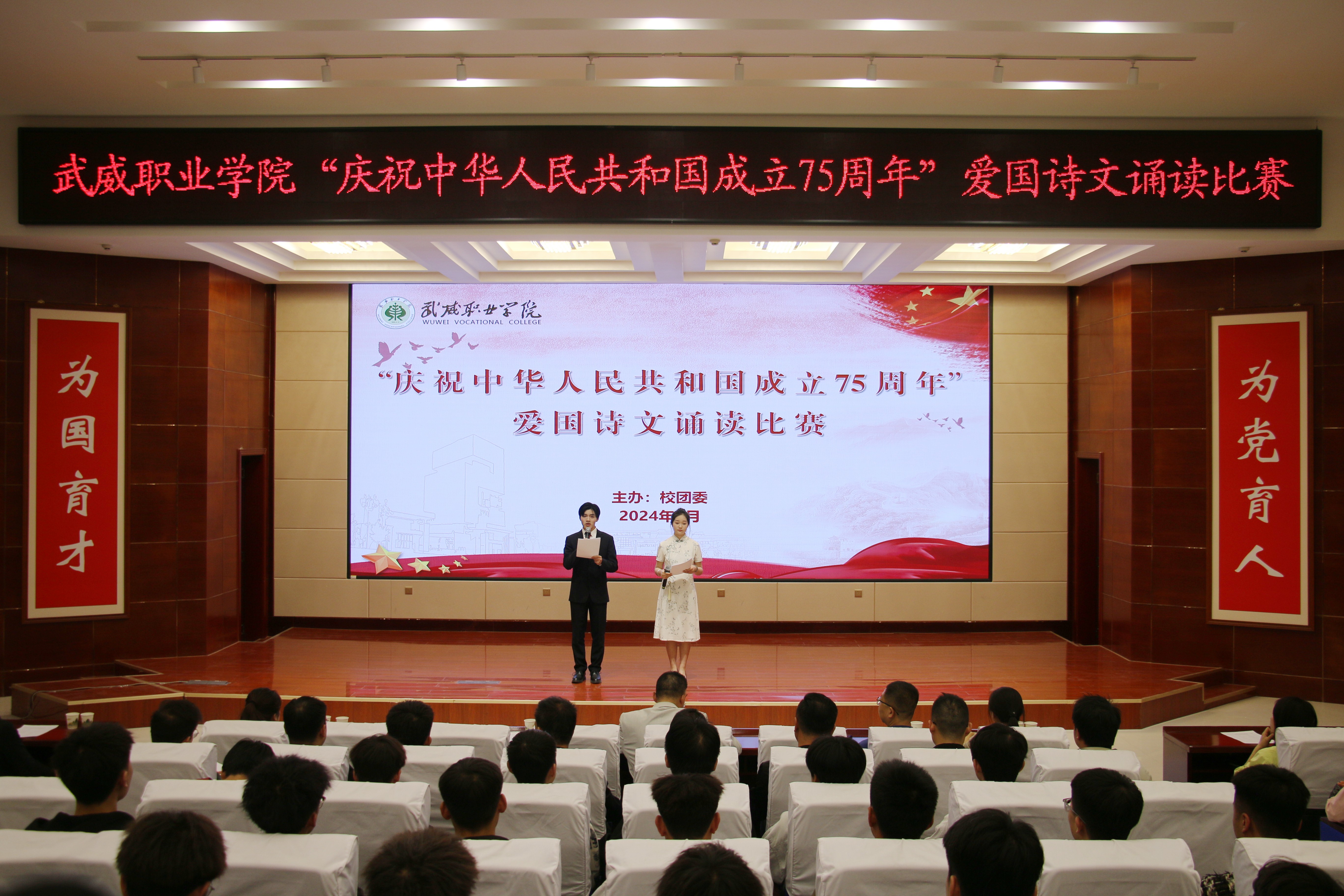 4月25日晚,學?!凹o念‘五四’運動105周年暨慶祝新中國成立75周年”愛國詩文誦讀比賽在菁英廳舉辦。黨委委員、副校長王守云出席活動,各二級學院團委書記及學生代表220余人觀看比賽。