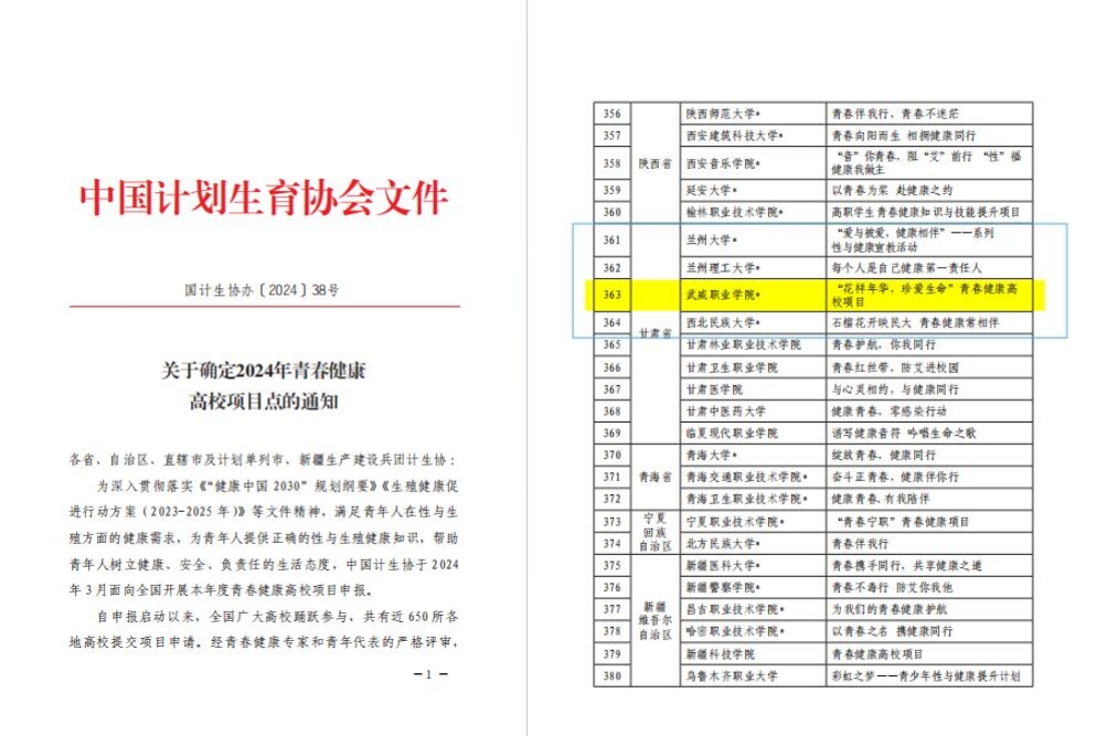 日前,中國計劃生育協(xié)會發(fā)布《關(guān)于確定2024年青春健康高校項目點的通知》,我校學生工作部、校團委、護理學院共同申報的“花樣年華,珍愛生命”項目,從全國各地500余所高校中脫穎而出,自2022年以來連續(xù)三次成功中標中國計生協(xié)專項資助A類項目,成為甘肅省中標A類項目院校中唯一一所高職院校。