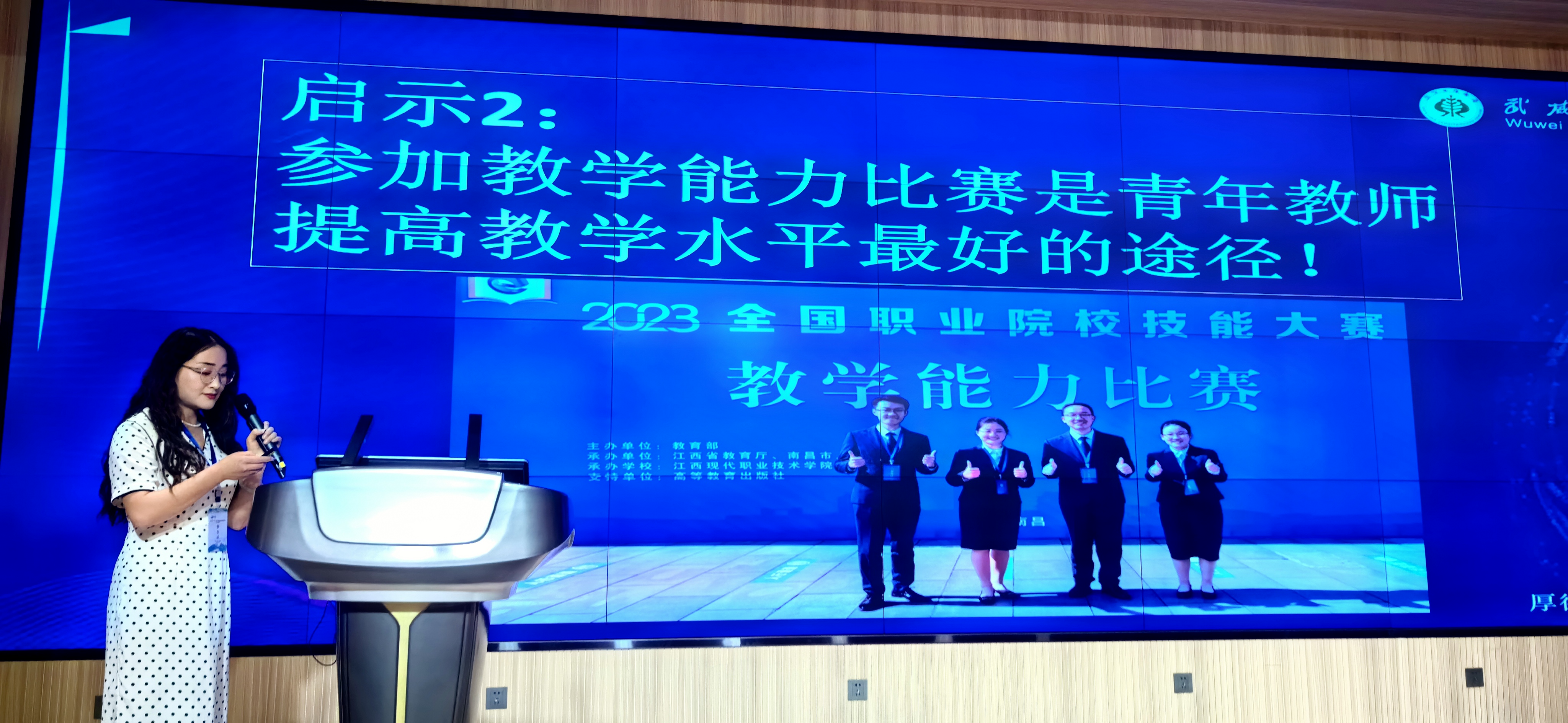 在年會(huì)上,集群內(nèi)職業(yè)院校代表簽署中高職貫通培養(yǎng)合作協(xié)議,武威職業(yè)學(xué)院與武威市涼州區(qū)職業(yè)中等專業(yè)學(xué)校進(jìn)行了簽約。根據(jù)省教育廳安排,我校中科低碳新能源技術(shù)學(xué)院教師楊彥紅在分會(huì)上分享了全國(guó)職業(yè)院校技能大賽教學(xué)能力比賽的經(jīng)驗(yàn),楊彥紅老師分三個(gè)方面向大家分享了參賽經(jīng)驗(yàn)及參賽作品的特色創(chuàng)新亮點(diǎn),也向參會(huì)的各行各業(yè)人士分享了武威職業(yè)學(xué)院近四年以來(lái)在教學(xué)能力比賽方面取得的好成績(jī)。