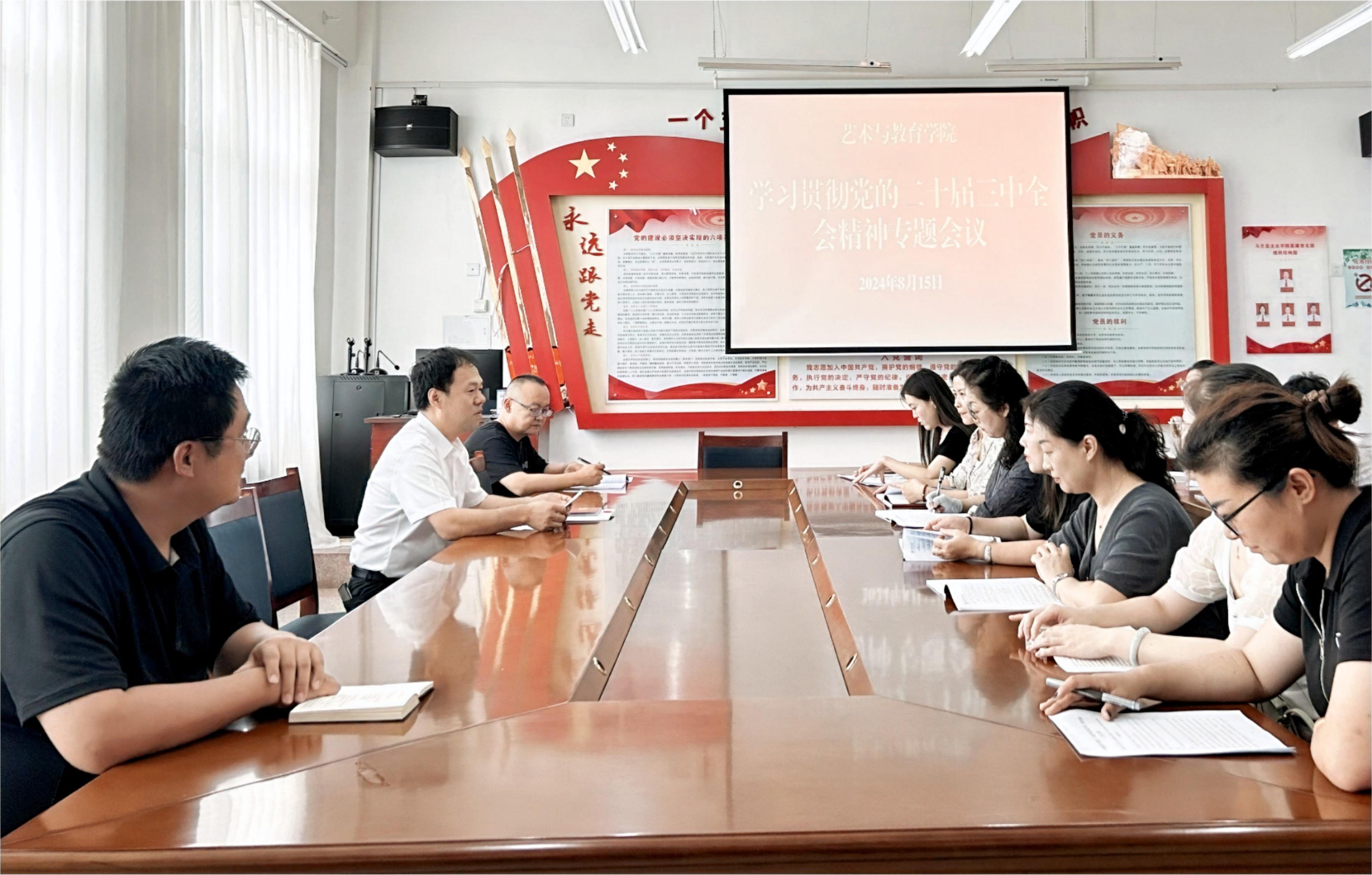 8月15日,藝術(shù)與教育學(xué)院召開黨的二十屆三中全會(huì)精神專題學(xué)習(xí)會(huì)議,傳達(dá)學(xué)習(xí)《習(xí)近平總書記關(guān)于<中共中央關(guān)于進(jìn)一步全面深化改革、推進(jìn)中國(guó)式現(xiàn)代化的決定>的說(shuō)明》《中國(guó)共產(chǎn)黨第二十屆中央委員會(huì)第三次全體會(huì)議公報(bào)》《中共中央關(guān)于進(jìn)一步全面深化改革推進(jìn)中國(guó)式現(xiàn)代化的決定》,以及《深化教育綜合改革》等內(nèi)容。會(huì)議由學(xué)院黨總支書記王政主持,全體教職工參加會(huì)議。