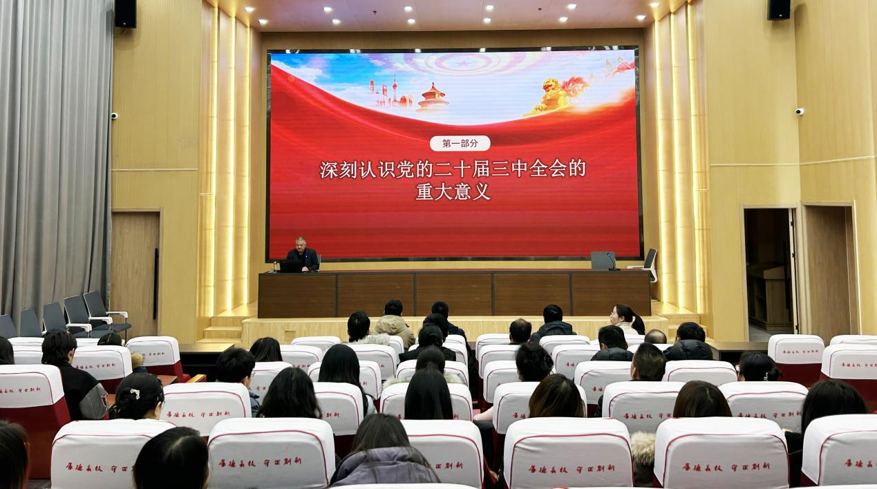 1月3日下午,黨委委員、副校長王守云在能源科技樓學(xué)術(shù)報告廳為經(jīng)濟管理學(xué)院、藝術(shù)與教育學(xué)院師生帶來了一場生動而有深度的專題黨課報告會,深入解讀黨的二十屆三中全會精神和習(xí)近平總書記視察甘肅重要講話重要指示精神。兩學(xué)院黨員、預(yù)備黨員、入黨積極分子、師生代表共100余人參加。