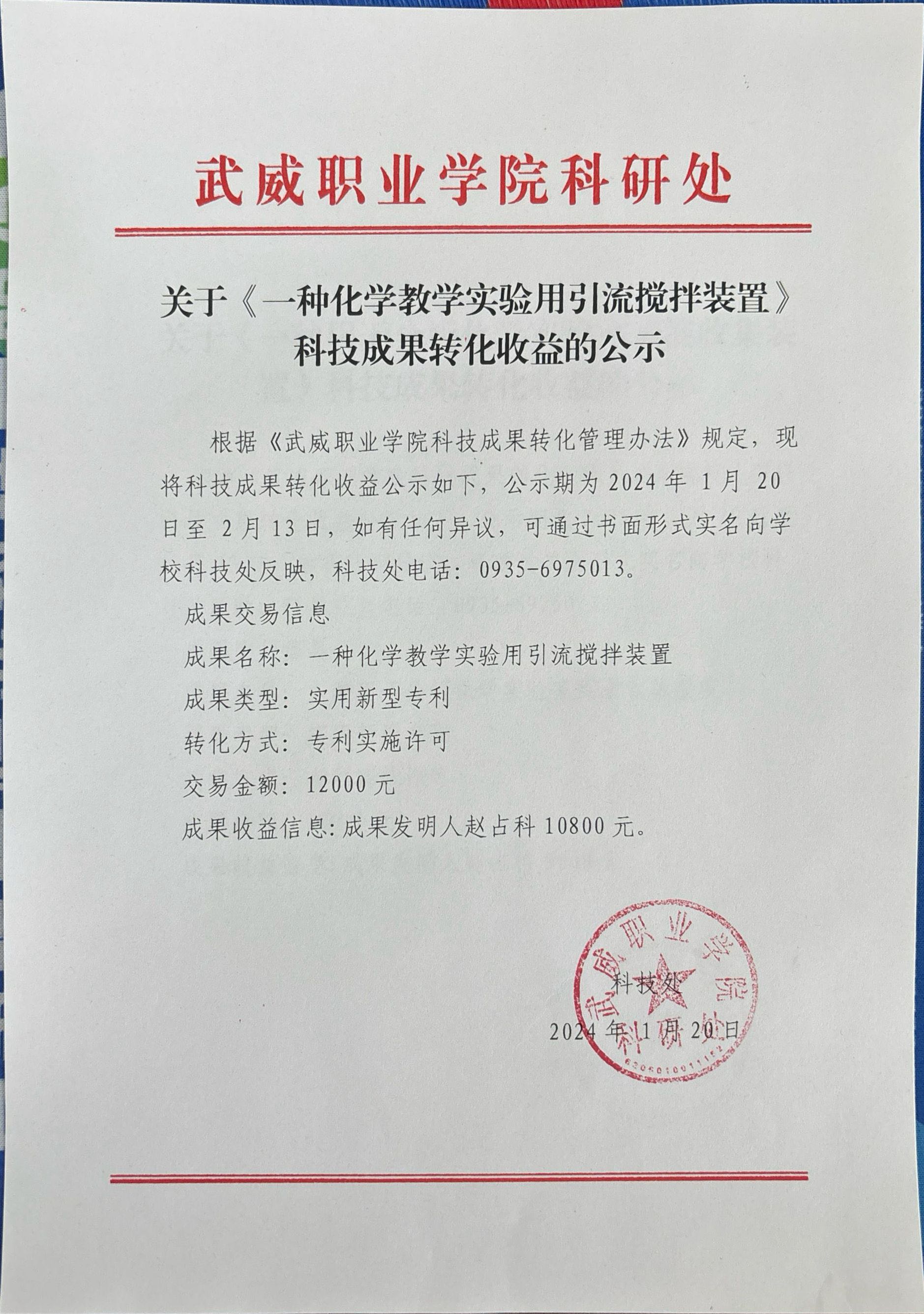 關于《一種化學教學實驗用引流攪拌裝置》科技成果轉(zhuǎn)化收益的公示