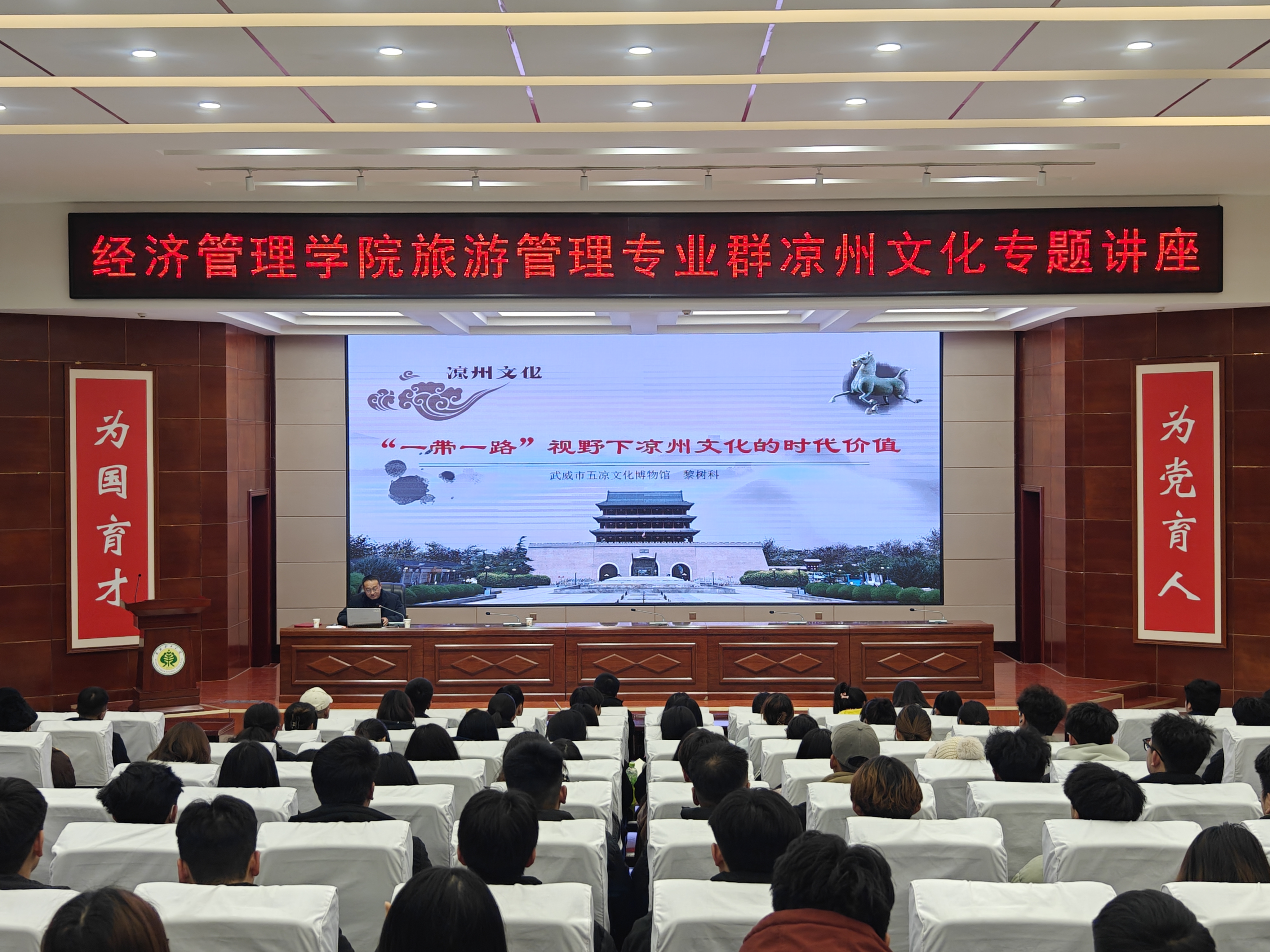 ? ? 12月11日下午,經(jīng)濟(jì)管理學(xué)院邀請(qǐng)武威市五涼文化博物館館長(zhǎng)黎樹科開展了以《“一帶一路” 視野下涼州文化的時(shí)代價(jià)值》為主題的講座,旨在深入貫徹文化傳承發(fā)展戰(zhàn)略,加強(qiáng)傳統(tǒng)文化的弘揚(yáng)與教育。學(xué)院近200名師生參加此次講座。