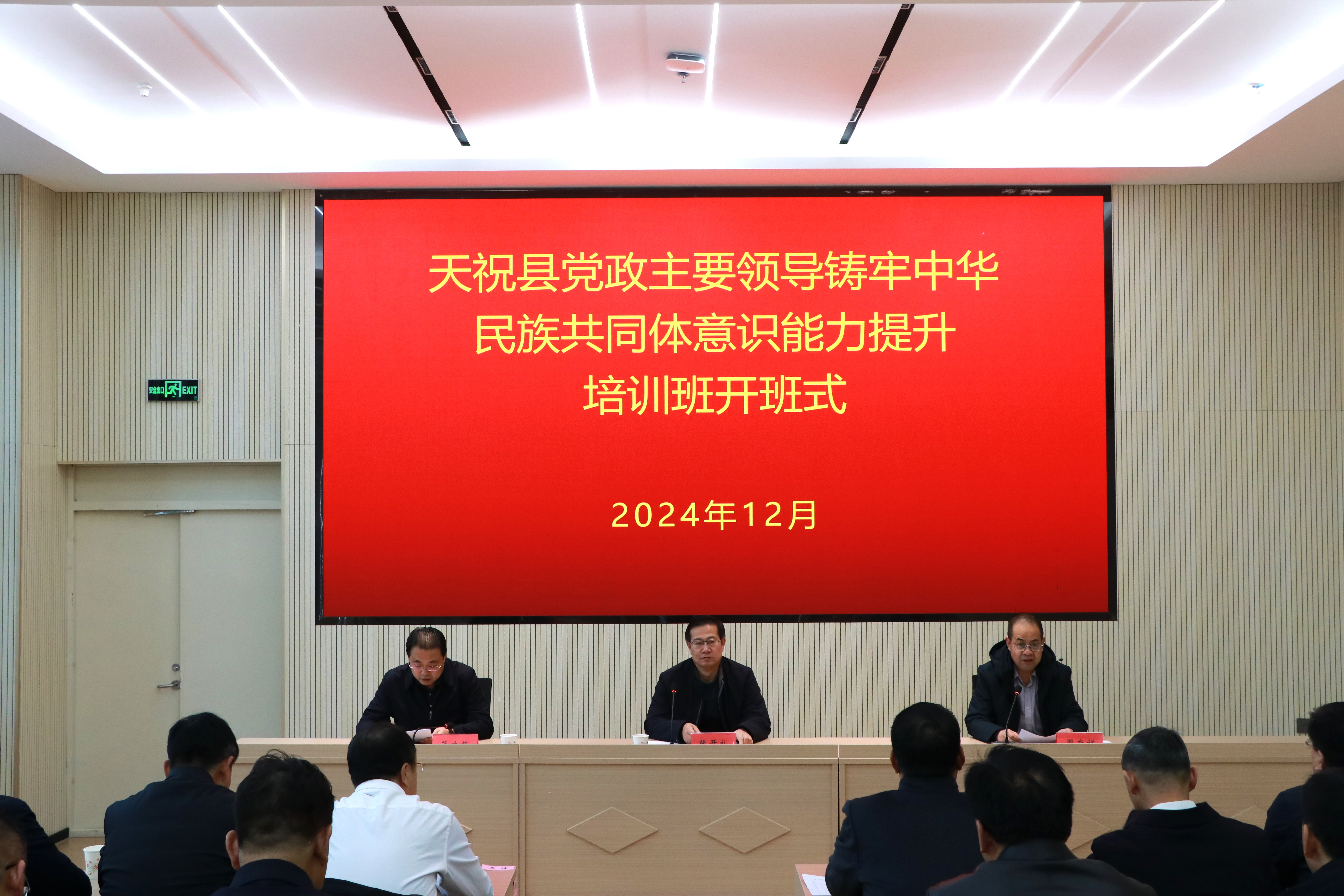 12月3日,由天??h委組織部主辦,我校承辦的“天??h黨政主要領(lǐng)導(dǎo)鑄牢中華民族共同體意識能力提升培訓(xùn)班”在圖書館二樓報(bào)告廳順利開班。天??h委常委、組織部部長蔣生榮,學(xué)校校長、黨委副書記張開禮出席開班式。開班式由學(xué)校黨委副書記翟存祥主持,天??h縣鄉(xiāng)兩級黨政主要領(lǐng)導(dǎo)90余人參加。
