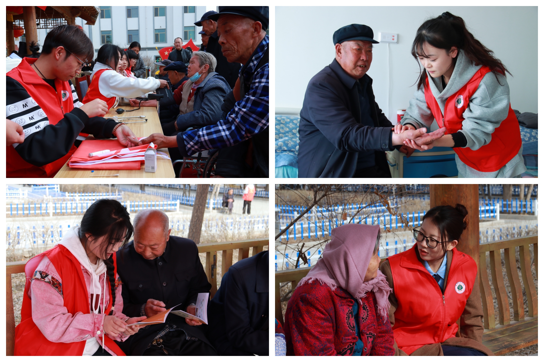 在健康慰問環(huán)節(jié),護(hù)理學(xué)院志愿者結(jié)合專業(yè)特色,分組為老人測量血壓、血糖,并耐心給老人講解養(yǎng)生知識,告知在日常生活起居中的注意事項,以專業(yè)技能守護(hù)老人健康。